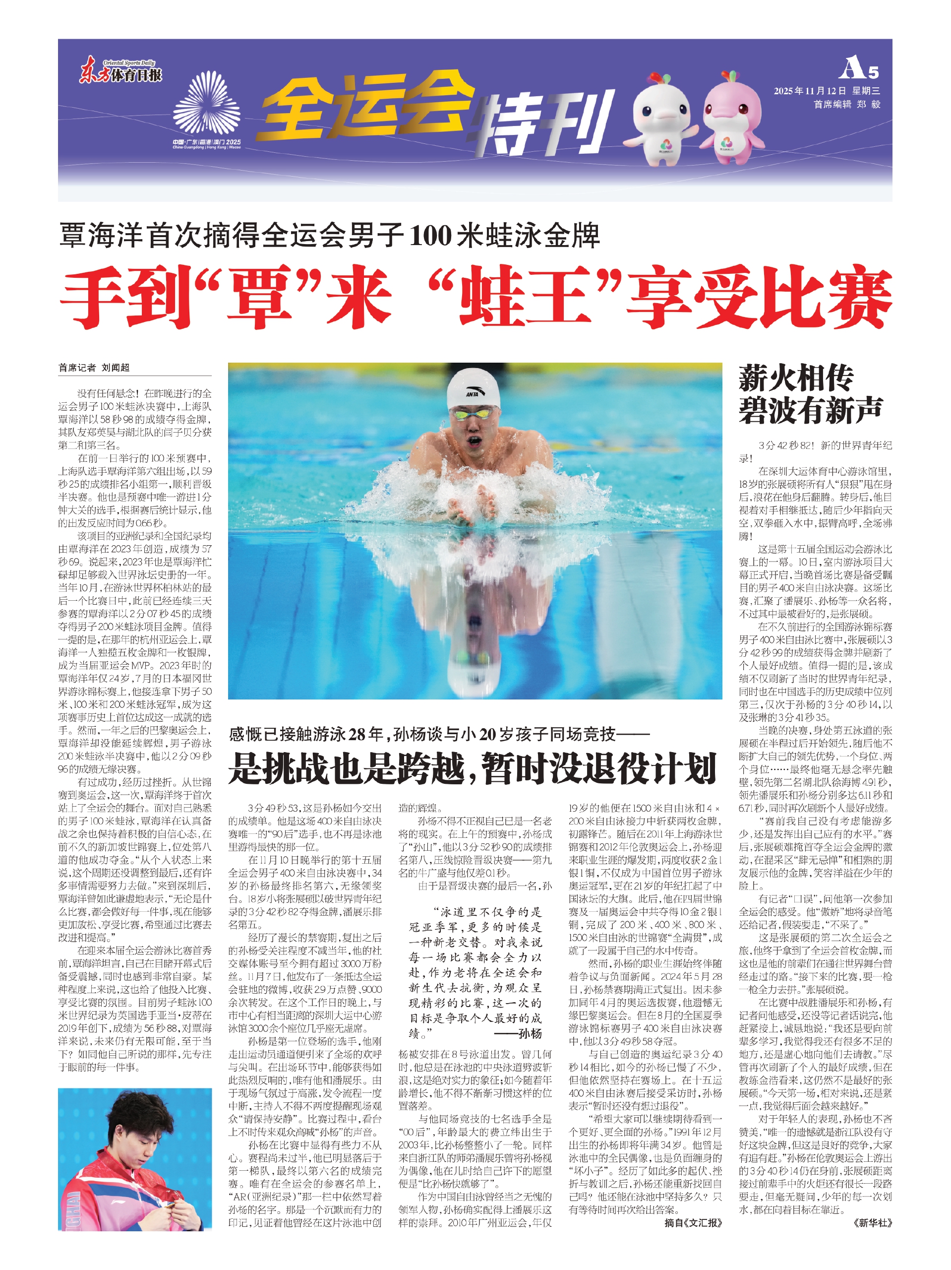 有过成功,经历过挫折。从世锦赛到奥运会,这一次,覃海洋终于首次站上了全运会的舞台。面对自己熟悉的男子100米蛙泳,覃海洋在认真备战之余也保持着积极的自信心态,在前不久的新加坡世锦赛上,位处第八道的他成功夺金。“从个人状态上来说,这个周期还没调整到最后,还有许多事情需要努力去做。”来到深圳后,覃海洋曾如此谦虚地表示,“无论是什么比赛,都会做好每一件事,现在能够更加放松、享受比赛,希望通过比赛去改进和提高。”