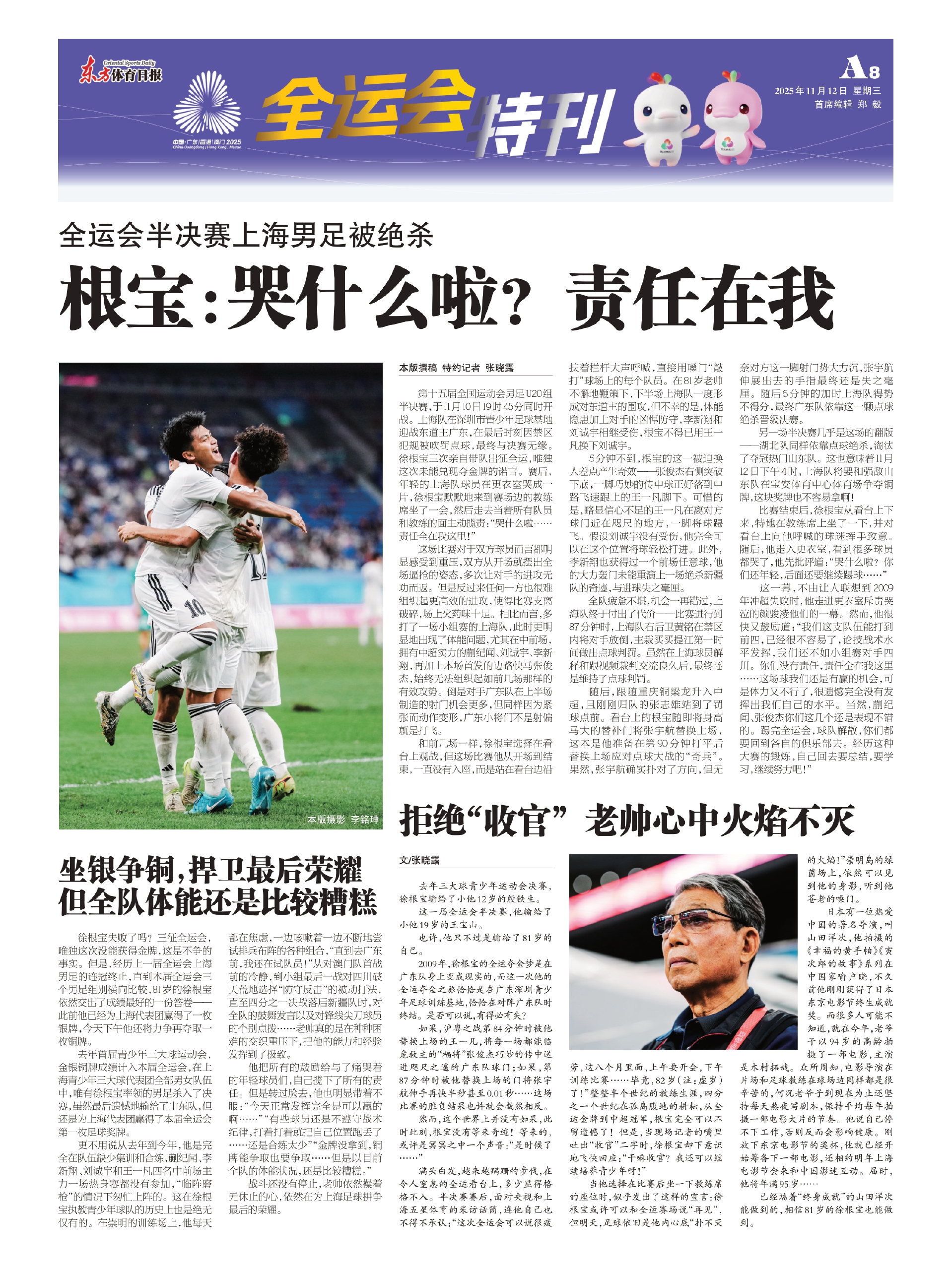 徐根宝失败了吗?三征全运会,唯独这次没能获得金牌,这是不争的事实。但是,经历上一届全运会上海男足的连冠终止,直到本届全运会三个男足组别横向比较,81岁的徐根宝依然交出了成绩最好的一份答卷——此前他已经为上海代表团赢得了一枚银牌,今天下午他还将力争再夺取一枚铜牌。