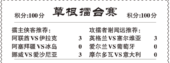 编者按:东方彩经竞彩大联赛从2017年3月起推出“草根擂台赛”,每期由两名草根选手单选3场比赛PK,中1场得100分,中2场得300分,3场全中得600分。上周擂主命中1场,攻擂者命中1场。