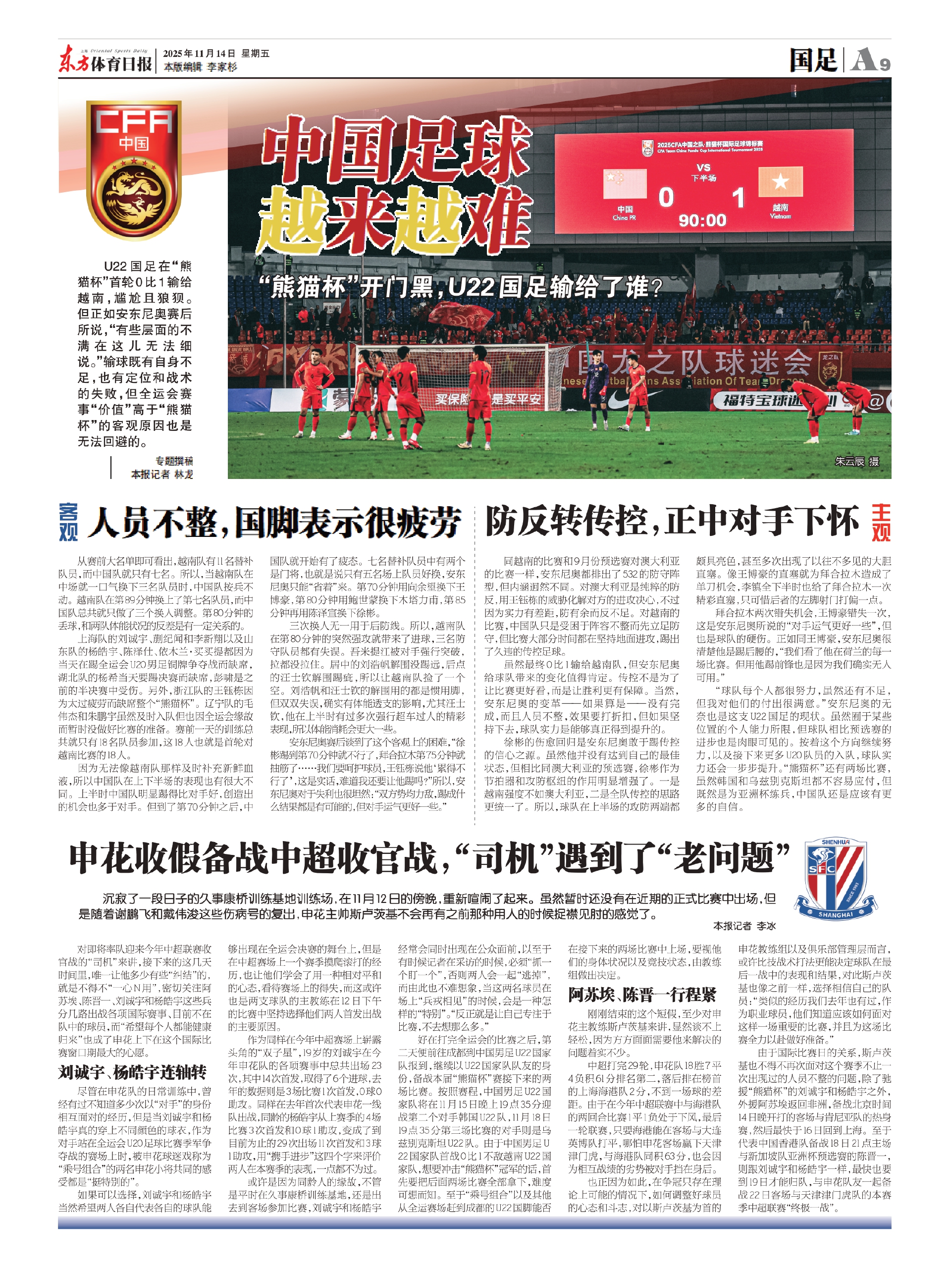 因为无法像越南队那样及时补充新鲜血液,所以中国队在上下半场的表现也有很大不同。上半时中国队明显踢得比对手好,创造出的机会也多于对手。但到了第70分钟之后,中国队就开始有了疲态。七名替补队员中有两个是门将,也就是说只有五名场上队员好换,安东尼奥只能“省着”来。第70分钟用向余望换下王博豪,第80分钟用鲍世蒙换下木塔力甫,第85分钟再用陈泽宣换下徐彬。