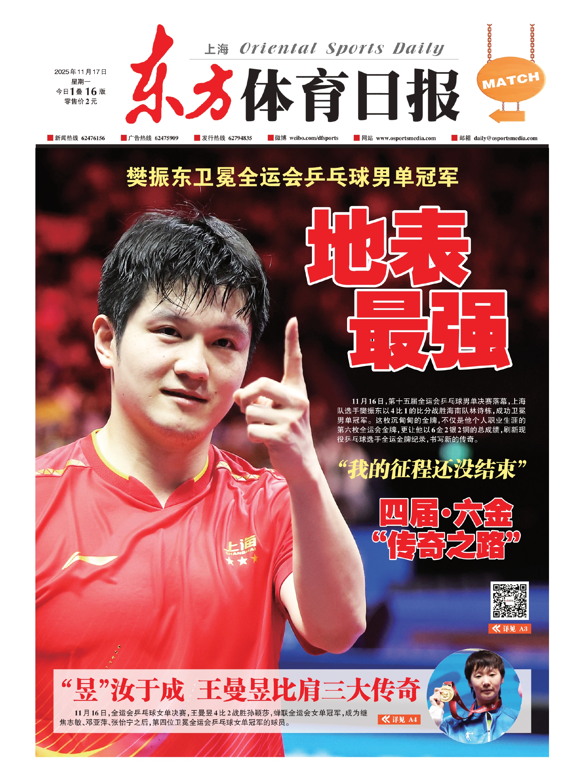 11月16日,第十五届全运会乒乓球男单决赛落幕,上海队选手樊振东以4比1的比分战胜海南队林诗栋,成功卫冕男单冠军。这枚沉甸甸的金牌,不仅是他个人职业生涯的第六枚全运会金牌,更让他以6金2银2铜的总成绩,刷新现役乒乓球选手全运金牌纪录,书写新的传奇。 “我的征程还没结束” 四届·六金 “传奇之路” 详见 A3