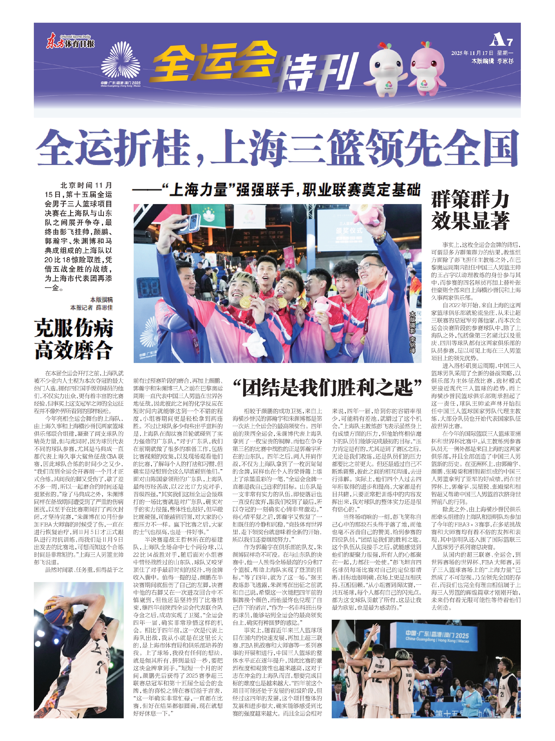 半决赛迎战王哲林所在的福建队,上海队全场命中七个两分球,以22比14战胜对手,随后面对小组赛中曾经战胜过的山东队,球队又咬牙顶住了对手最后时刻的反扑,将金牌收入囊中。值得一提的是,颜鹏在半决赛期间就扭伤了自己的左脚,决赛中他的右脚又在一次进攻回合中不慎崴到,但他还是坚持到了比赛结束,继四年前陕西全运会代表联合队夺金之后,成功实现了卫冕,“全运会四年一届,确实非常珍惜这样的机会。相比于四年前,这一次是代表上海队出战,我从小就是在这里长大的,是上海市体育局和俱乐部培养的我。上了球场,我没有任何的想法,就是倾其所有,拼到最后一秒,要把这块金牌拿到手。”短短一个月的时间,颜鹏先后获得了2025赛季超三联赛总冠军和第十五届全运会的金牌,他的喜悦之情在赛后溢于言表,“这一年确实非常忙碌,一直都在比赛,但好在结果都很圆满,现在就想好好休息一下。”