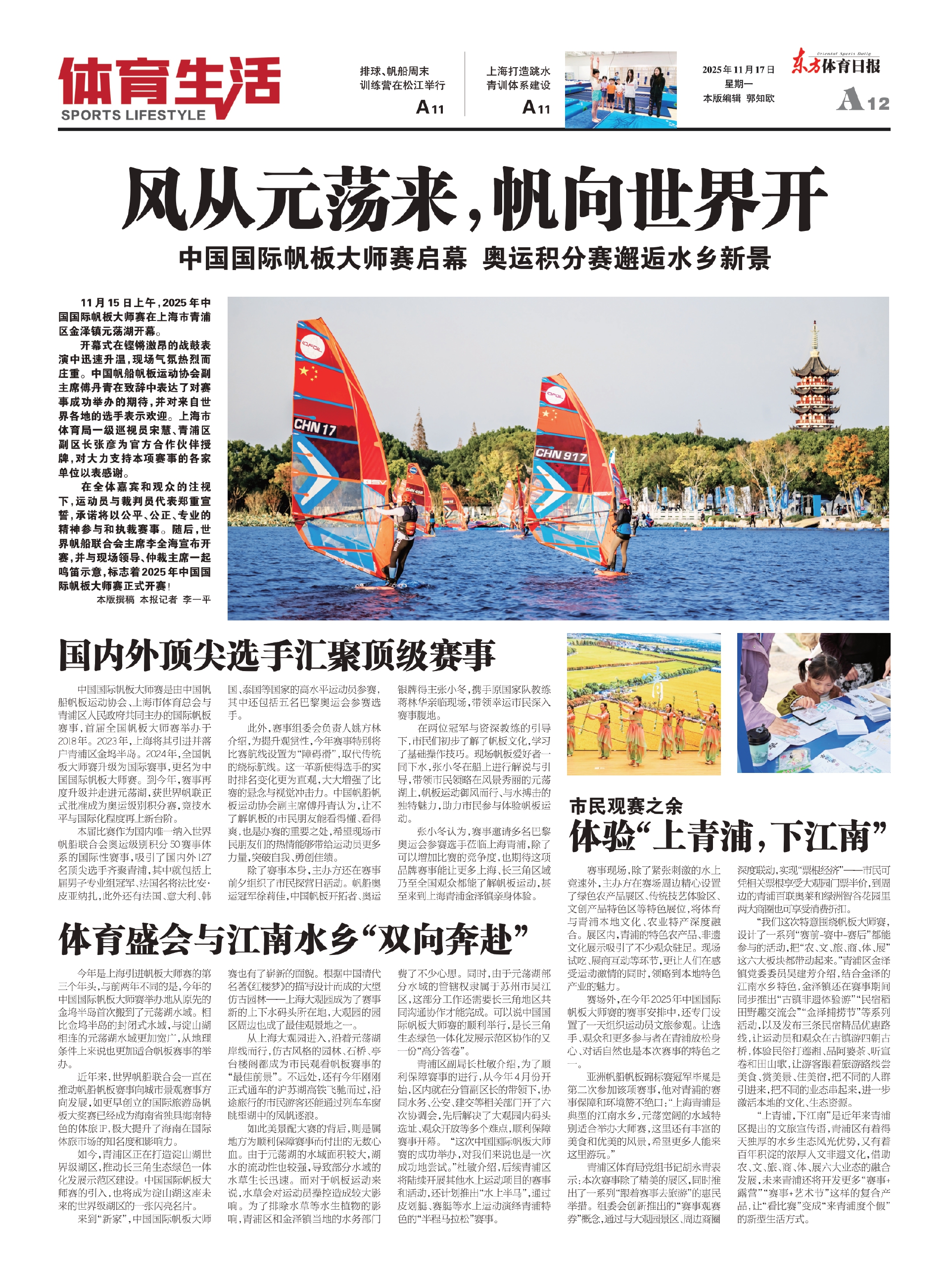 “我们这次特意围绕帆板大师赛,设计了一系列“赛前-赛中-赛后”都能参与的活动,把“农、文、旅、商、体、展”这六大板块都带动起来。”青浦区金泽镇党委委员吴建芳介绍,结合金泽的江南水乡特色,金泽镇还在赛事期间同步推出“古镇非遗体验游”“民宿稻田野趣交流会”“金泽捕捞节”等系列活动,以及发布三条民宿精品优惠路线,让运动员和观众在古镇游四朝古桥,体验民俗打莲湘、品阿婆茶、听宣卷和田山歌,让游客跟着旅游路线尝美食、赏美景、住美宿,把不同的人群引进来,把不同的业态串起来,进一步激活本地的文化、生态资源。