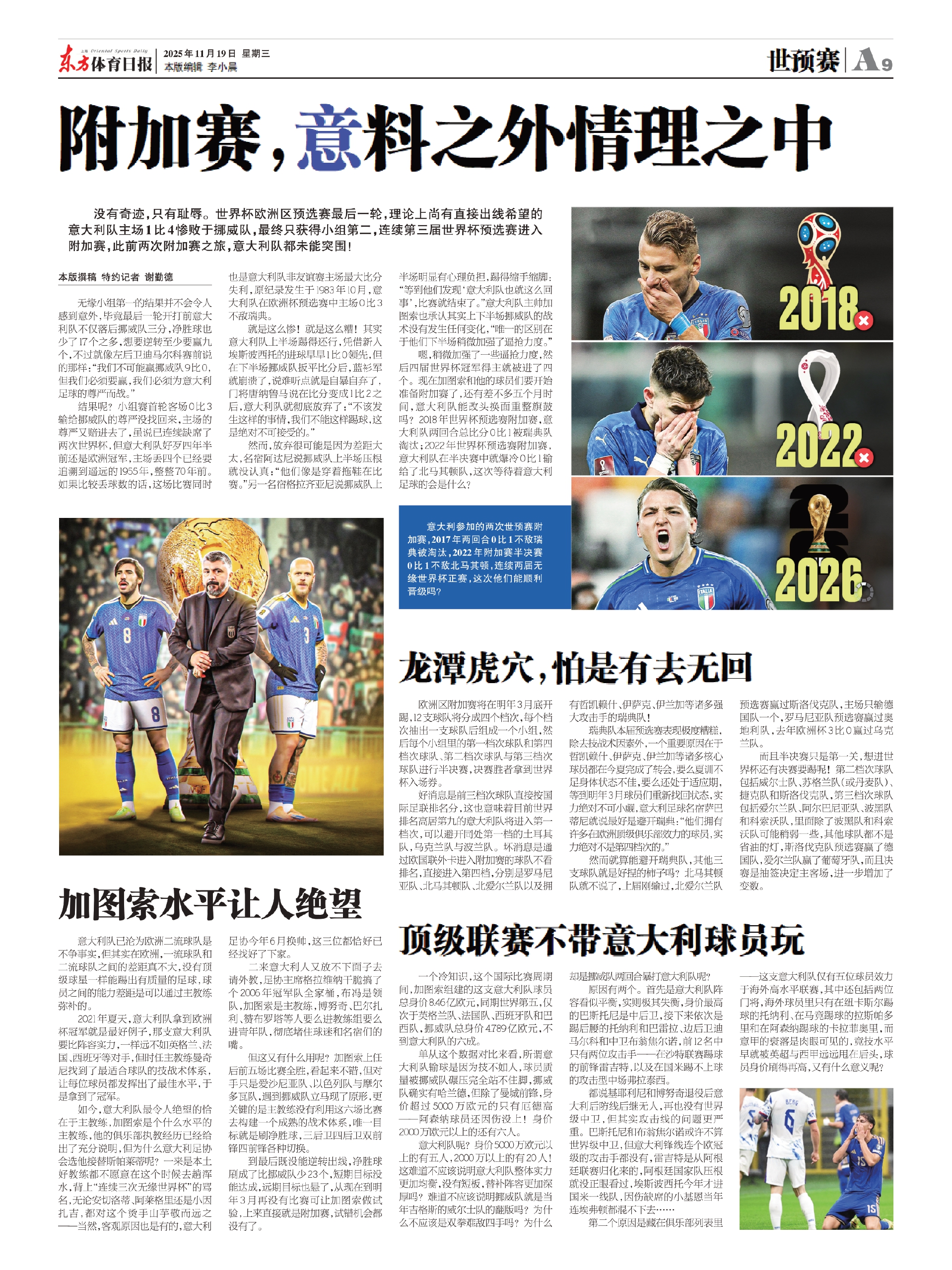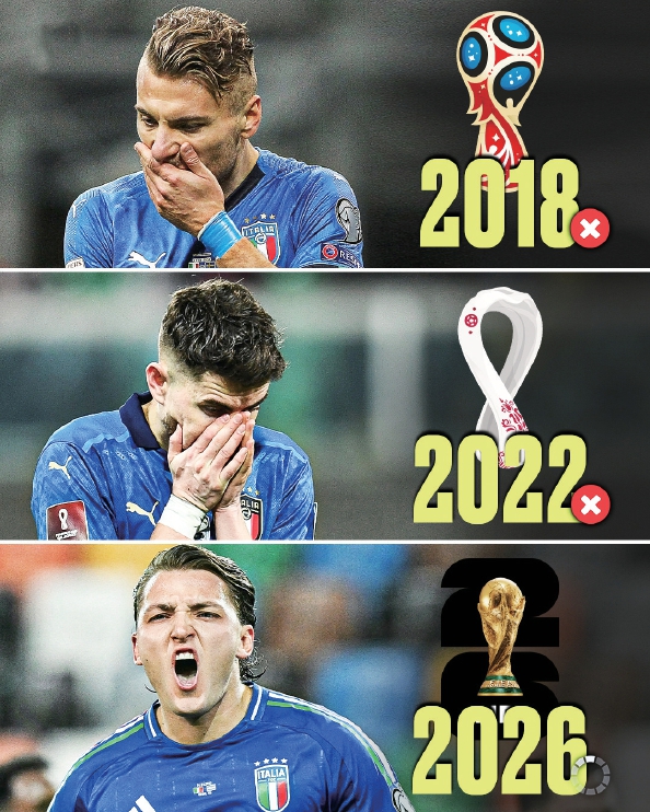 意大利参加的两次世预赛附加赛,2017年两回合0比1不敌瑞典被淘汰,2022年附加赛半决赛0比1不敌北马其顿,连续两届无缘世界杯正赛,这次他们能顺利晋级吗?