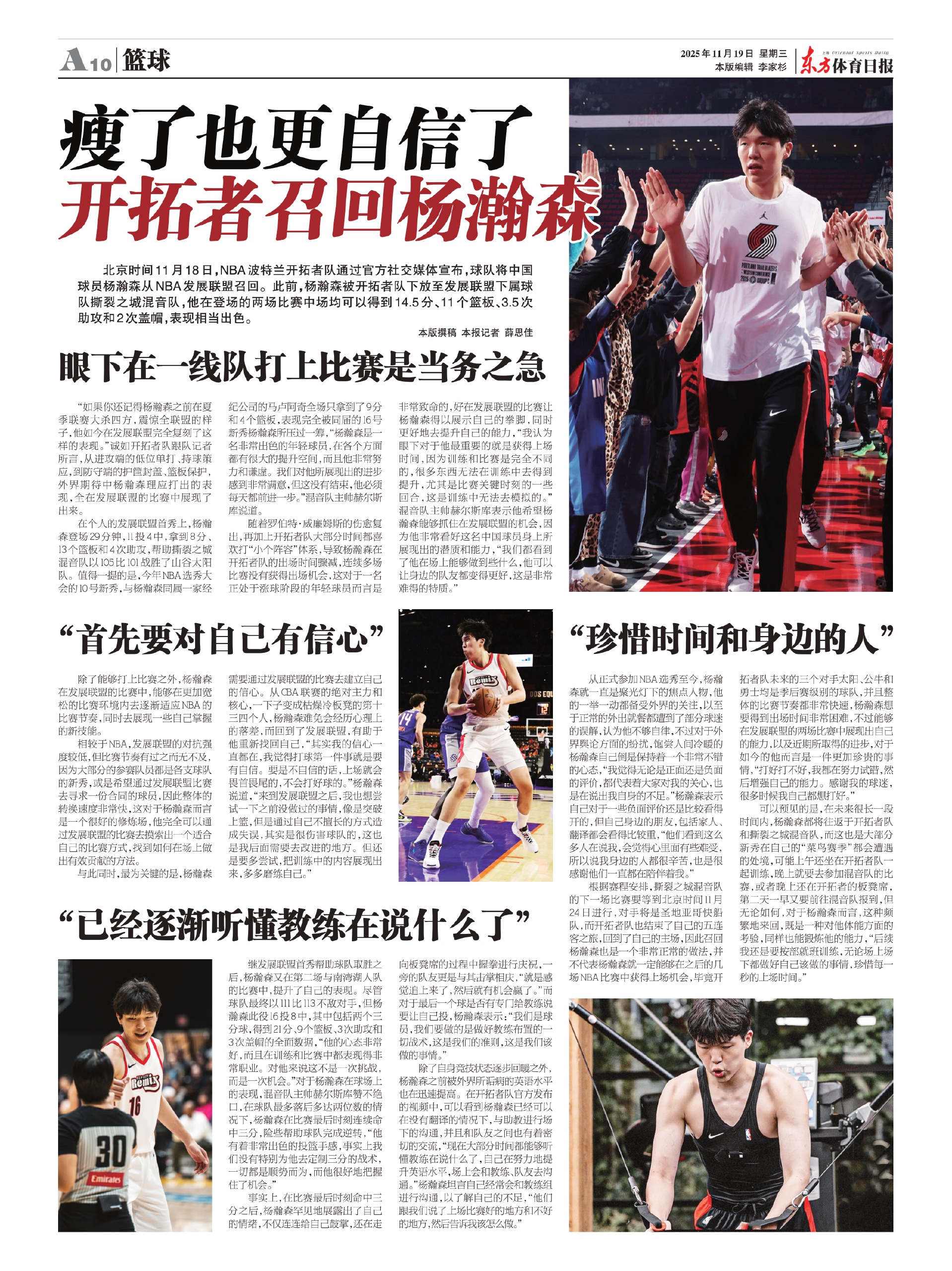 与此同时,最为关键的是,杨瀚森需要通过发展联盟的比赛去建立自己的信心。从CBA联赛的绝对主力和核心,一下子变成枯燥冷板凳的第十三四个人,杨瀚森难免会经历心理上的落差,而回到了发展联盟,有助于他重新找回自己,“其实我的信心一直都在,我觉得打球第一件事就是要有自信。要是不自信的话,上场就会畏首畏尾的,不会打好球的。”杨瀚森说道,“来到发展联盟之后,我也想尝试一下之前没做过的事情,像是突破上篮,但是通过自己不擅长的方式造成失误,其实是很伤害球队的,这也是我后面需要去改进的地方。但还是要多尝试,把训练中的内容展现出来,多多磨练自己。”