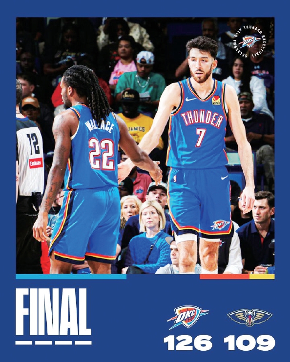 雷霆14胜1负排名西部第1位,主场6胜0负,上一场比赛客场126比109胜鹈鹕,首发是亚历山大、华莱士、多尔特、霍姆格伦、哈腾,亚历山大得到23分8助攻,霍姆格伦26分9篮板,多尔特17分1篮板,哈腾16分6助攻。
