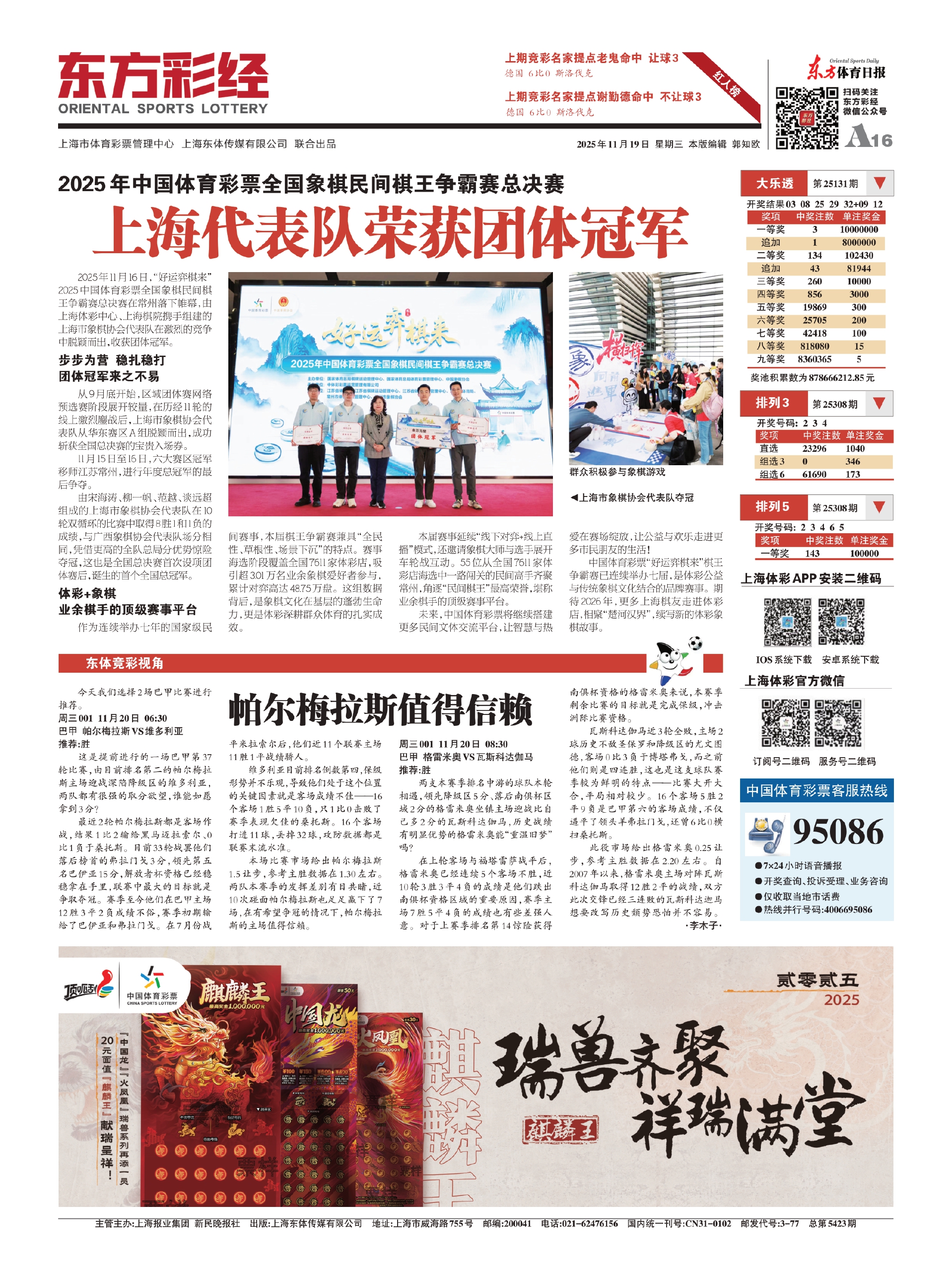 2025年11月16日,“好运弈棋来”2025中国体育彩票全国象棋民间棋王争霸赛总决赛在常州落下帷幕,由上海体彩中心、上海棋院携手组建的上海市象棋协会代表队在激烈的竞争中脱颖而出,收获团体冠军。