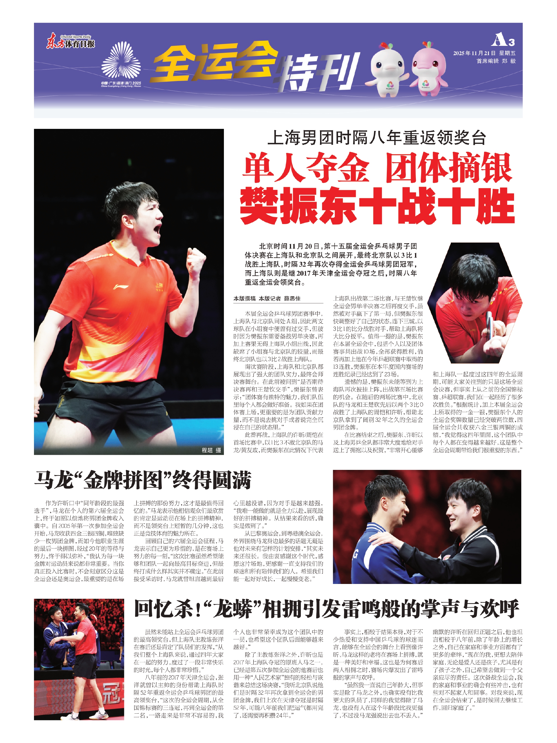 北京时间11月20日,第十五届全运会乒乓球男子团体决赛在上海队和北京队之间展开,最终北京队以3比1战胜上海队,时隔32年再次夺得全运会乒乓球男团冠军,而上海队则是继2017年天津全运会夺冠之后,时隔八年重返全运会领奖台。