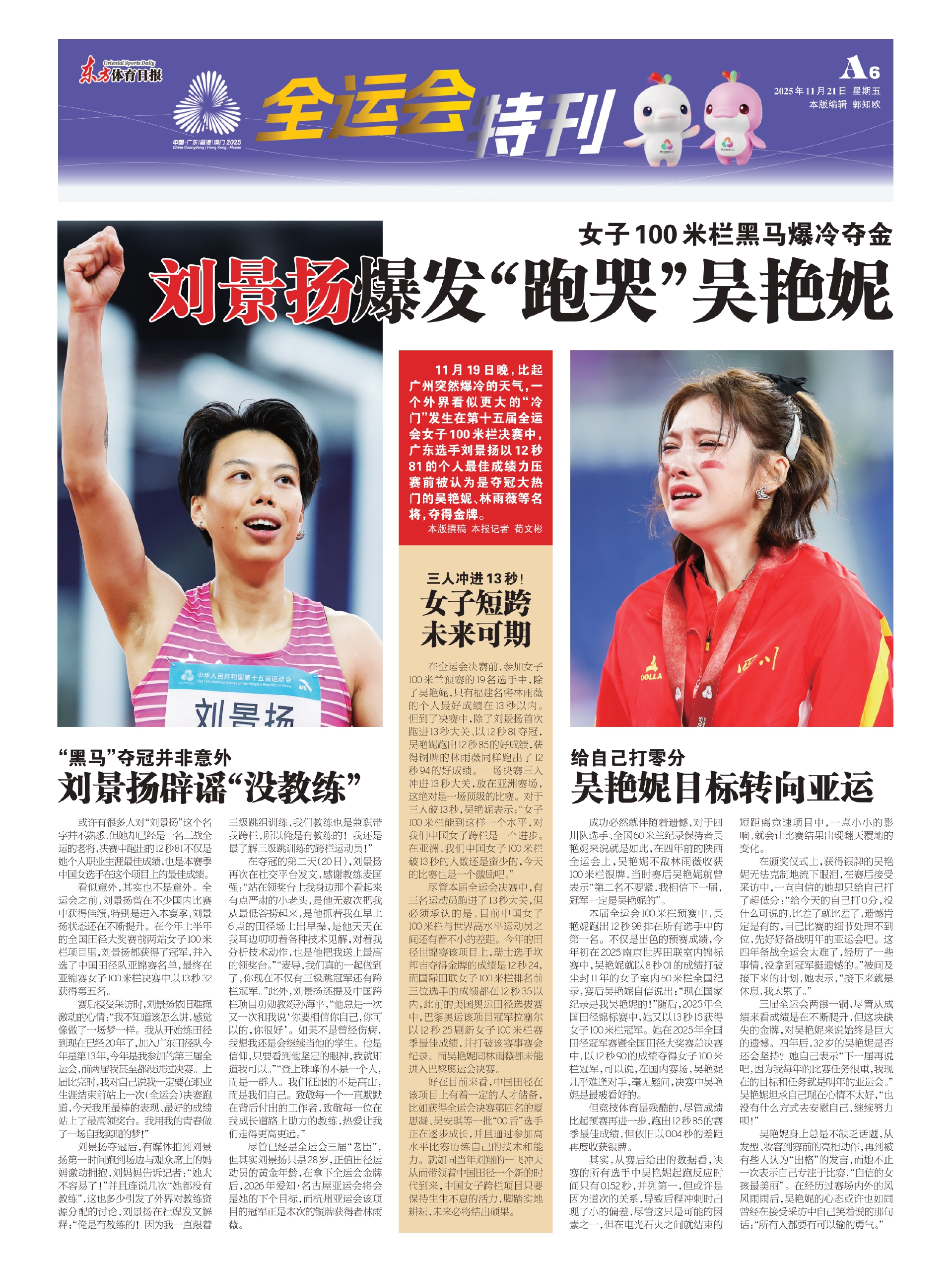 看似意外,其实也不是意外。全运会之前,刘景扬曾在不少国内比赛中获得佳绩,特别是进入本赛季,刘景扬状态还在不断提升。在今年上半年的全国田径大奖赛前两站女子100米栏项目里,刘景扬都获得了冠军,并入选了中国田径队亚锦赛名单,最终在亚锦赛女子100米栏决赛中以13秒32获得第五名。