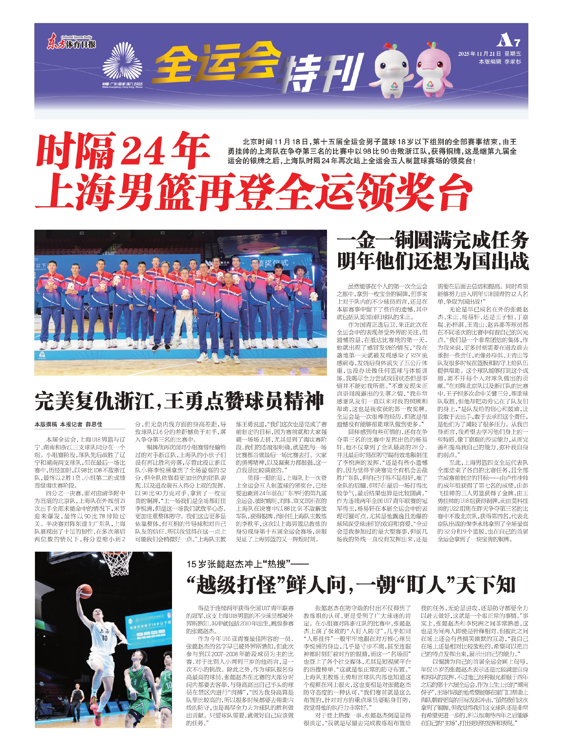 北京时间11月18日,第十五届全运会男子篮球18岁以下组别的全部赛事结束,由王勇挂帅的上海队在争夺第三名的比赛中以98比90击败浙江队,获得铜牌,这是继第九届全运会的银牌之后,上海队时隔24年再次站上全运会五人制篮球赛场的领奖台!