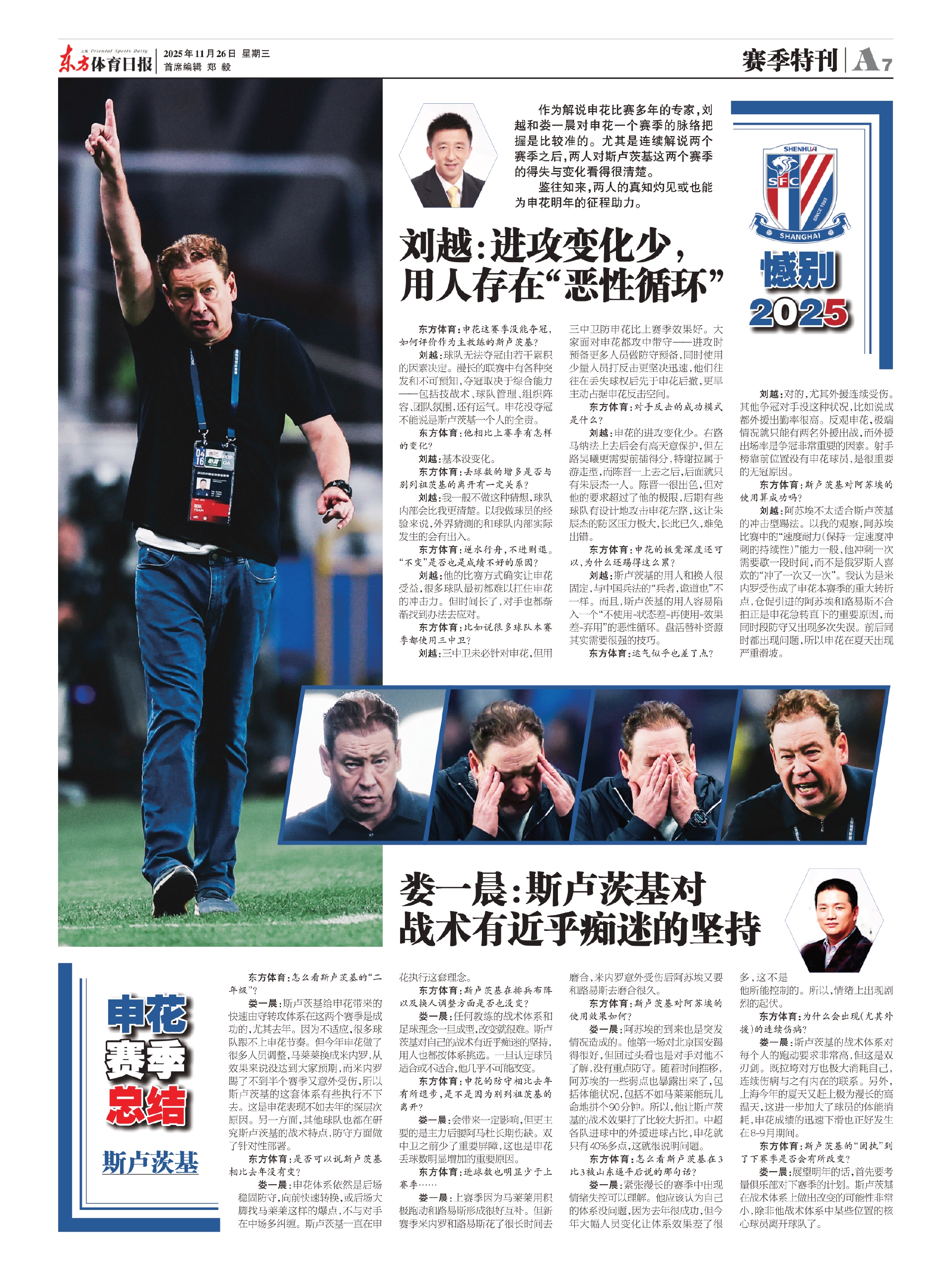 刘越:球队无法夺冠由若干累积的因素决定。漫长的联赛中有各种突发和不可预知,夺冠取决于综合能力——包括技战术、球队管理、组织阵容、团队氛围,还有运气。申花没夺冠不能说是斯卢茨基一个人的全责。