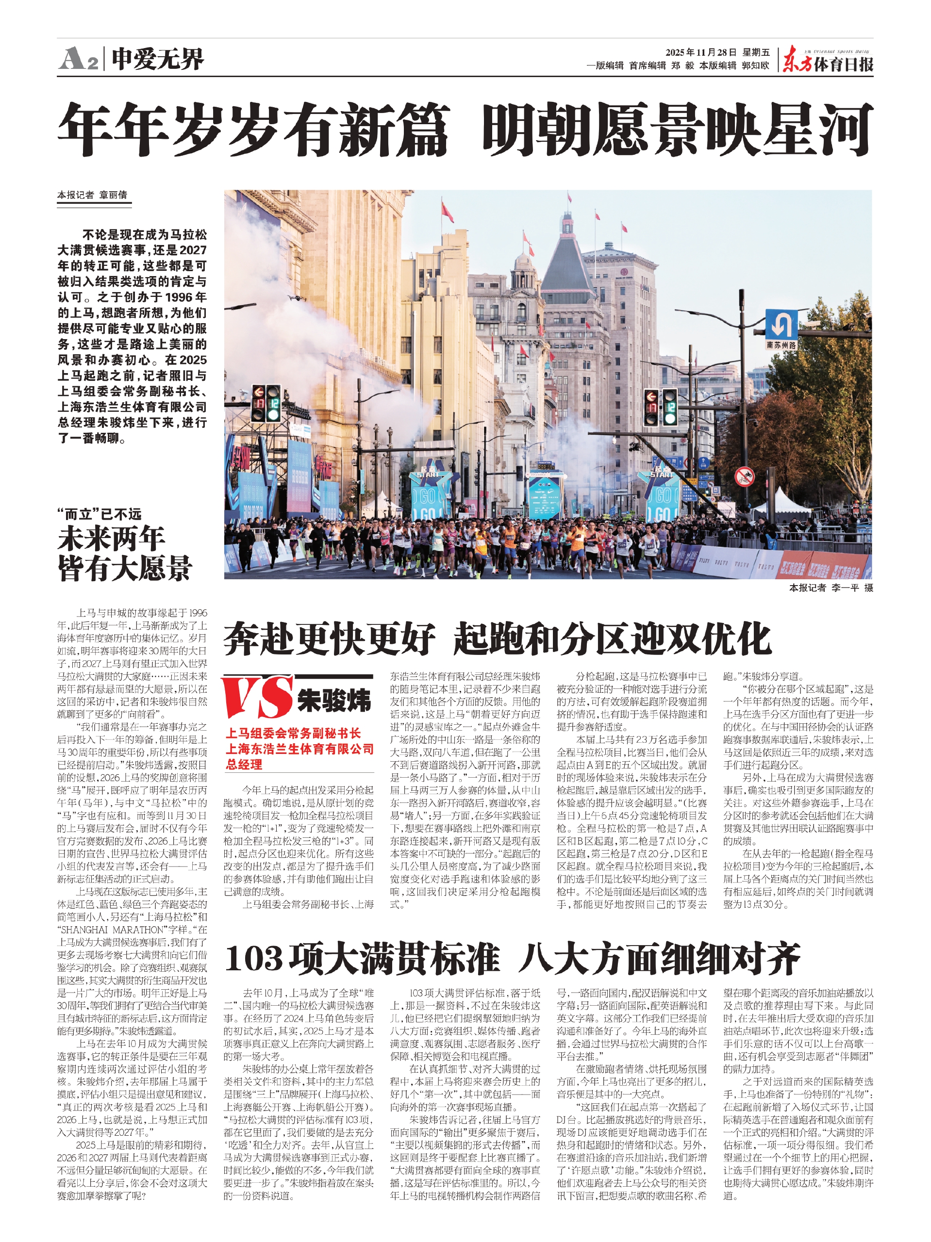 不论是现在成为马拉松大满贯候选赛事,还是2027年的转正可能,这些都是可被归入结果类选项的肯定与认可。之于创办于1996年的上马,想跑者所想,为他们提供尽可能专业又贴心的服务,这些才是路途上美丽的风景和办赛初心。在2025上马起跑之前,记者照旧与上马组委会常务副秘书长、上海东浩兰生体育有限公司总经理朱骏炜坐下来,进行了一番畅聊。