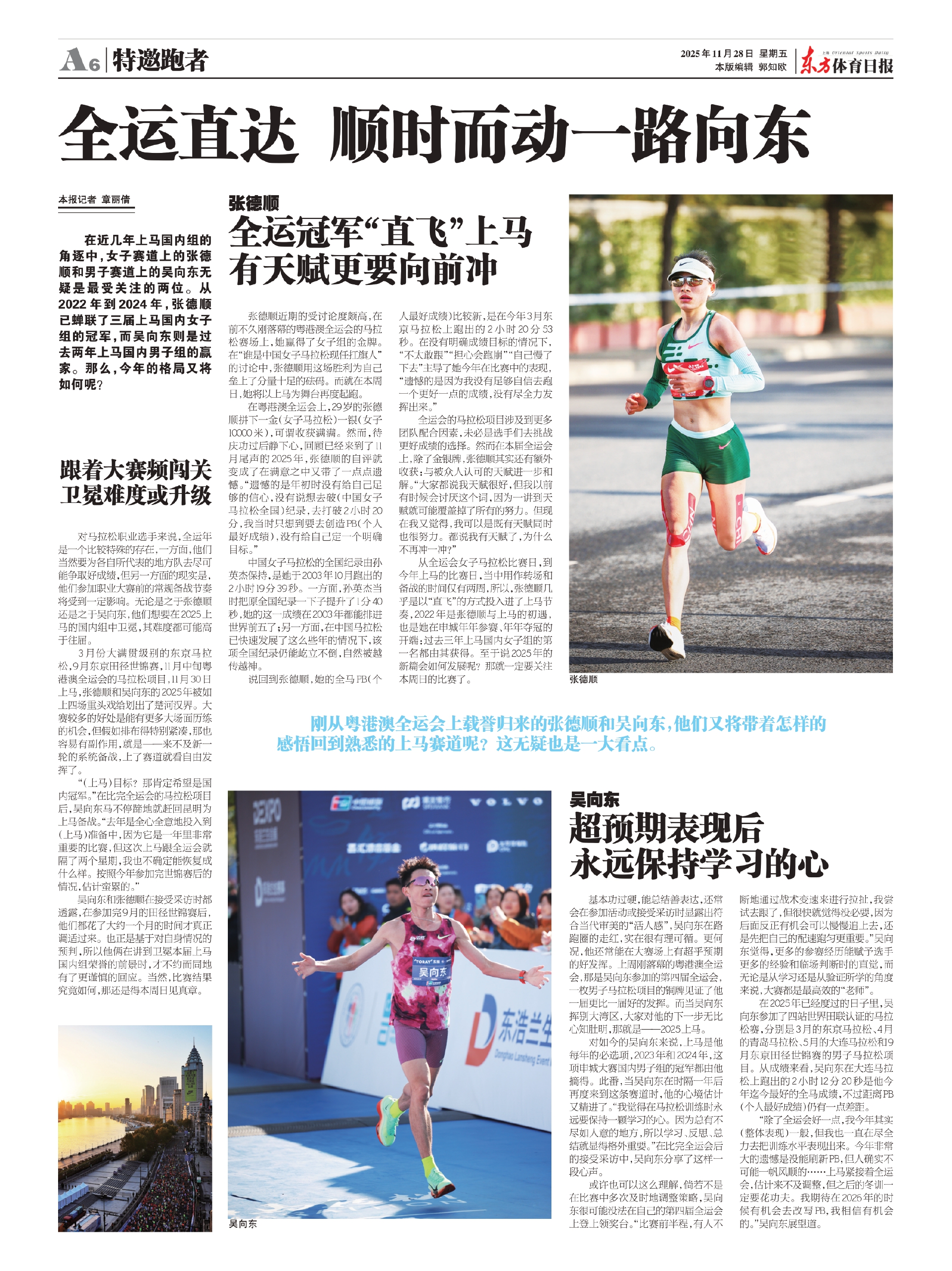 3月份大满贯级别的东京马拉松,9月东京田径世锦赛,11月中旬粤港澳全运会的马拉松项目,11月30日上马,张德顺和吴向东的2025年被如上四场重头戏给划出了楚河汉界。大赛较多的好处是能有更多大场面历练的机会,但假如排布得特别紧凑,那也容易有副作用,就是——来不及新一轮的系统备战,上了赛道就看自由发挥了。