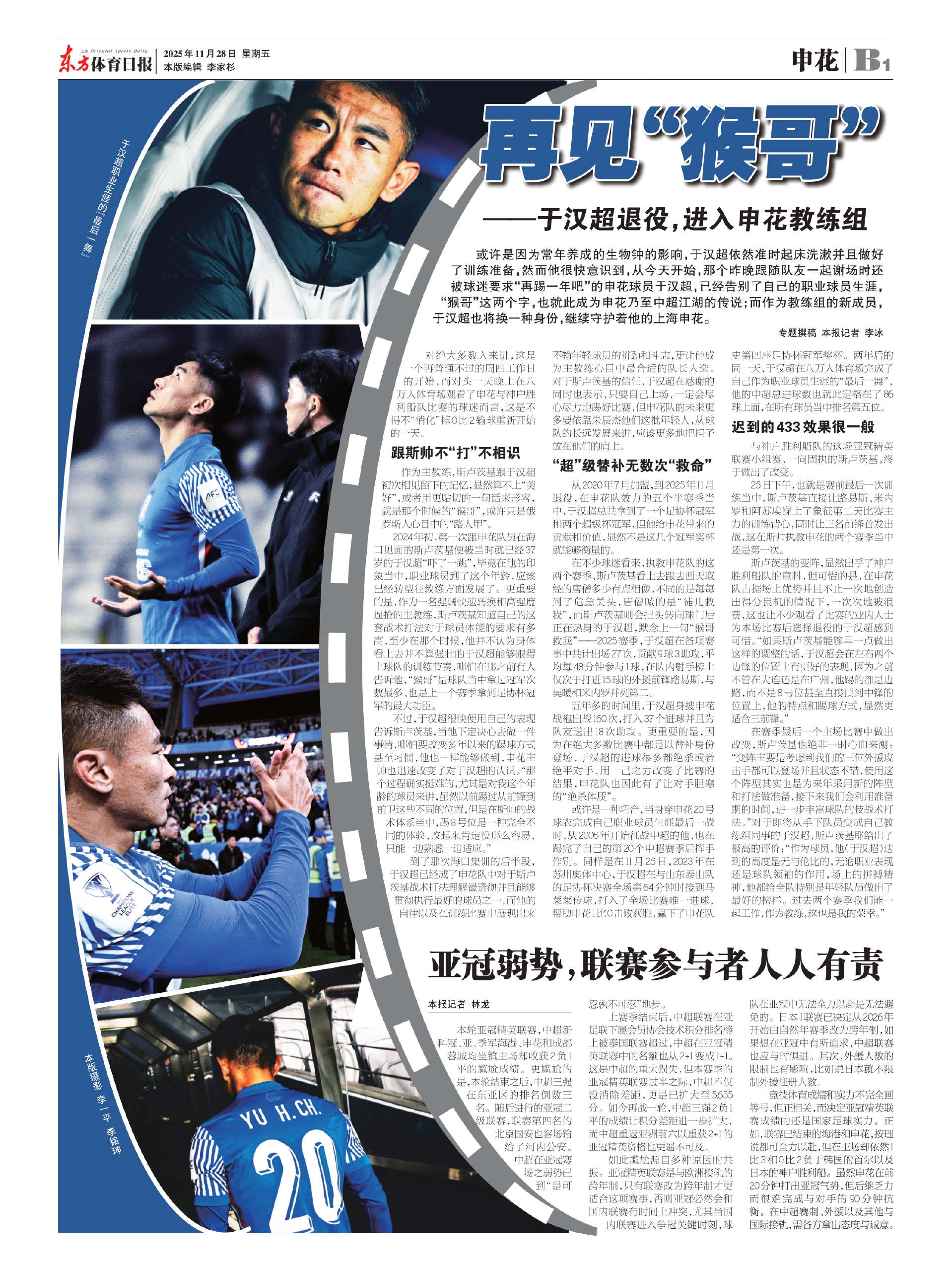 或许是因为常年养成的生物钟的影响,于汉超依然准时起床洗漱并且做好了训练准备,然而他很快意识到,从今天开始,那个昨晚跟随队友一起谢场时还被球迷要求“再踢一年吧”的申花球员于汉超,已经告别了自己的职业球员生涯,“猴哥”这两个字,也就此成为申花乃至中超江湖的传说;而作为教练组的新成员,于汉超也将换一种身份,继续守护着他的上海申花。