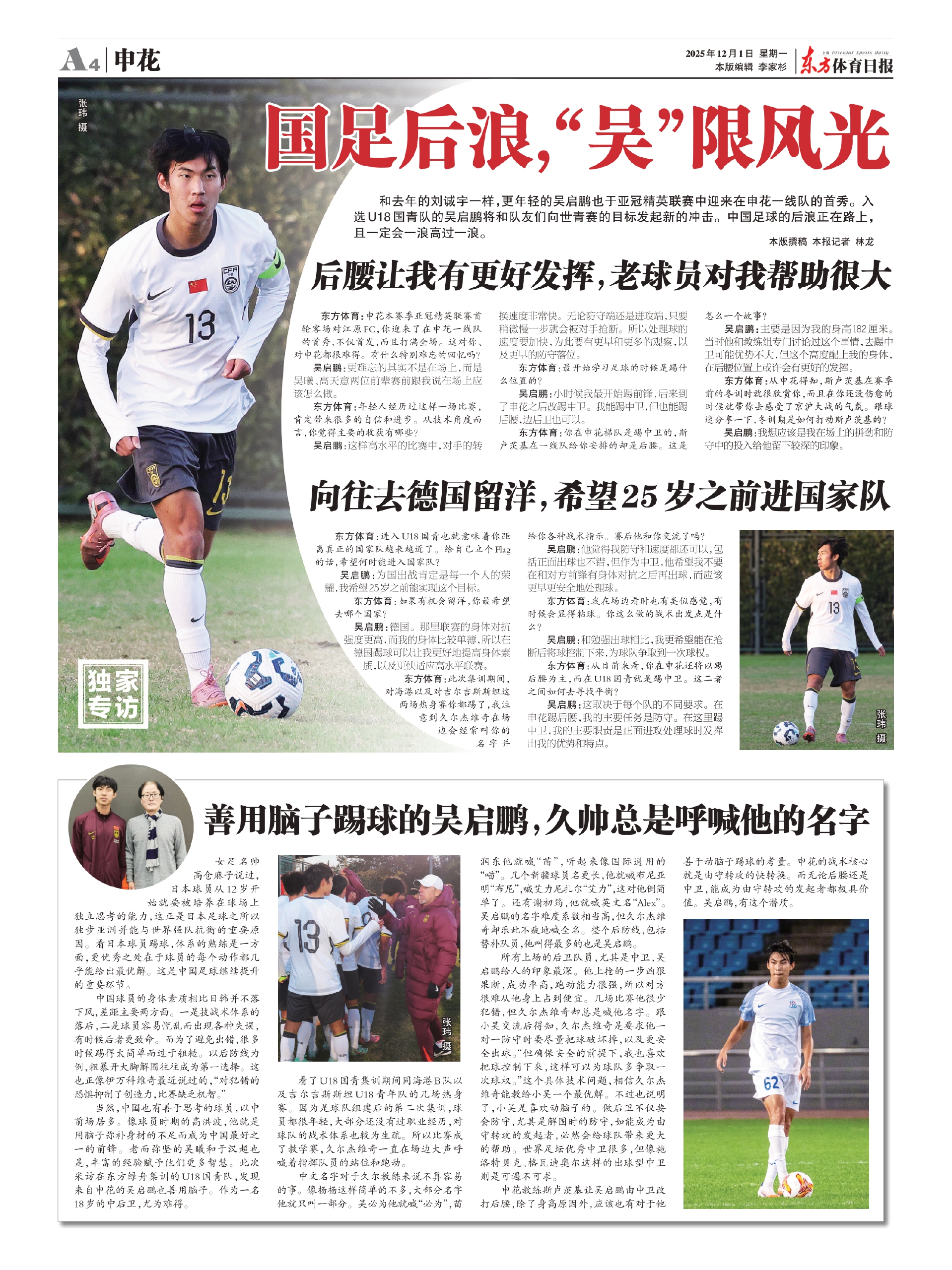 吴启鹏:小时候我最开始踢前锋,后来到了申花之后改踢中卫。我能踢中卫,但也能踢后腰,边后卫也可以。