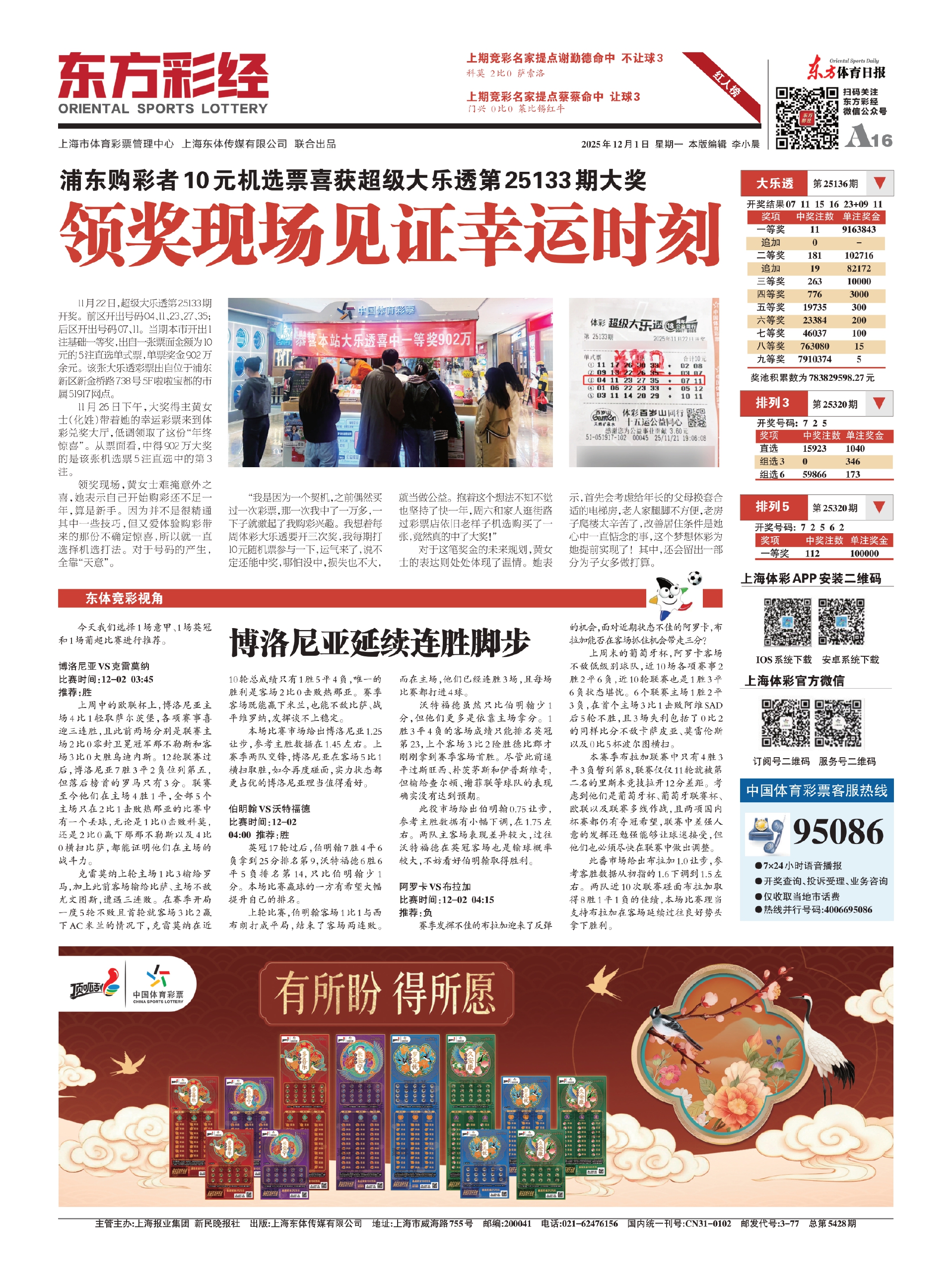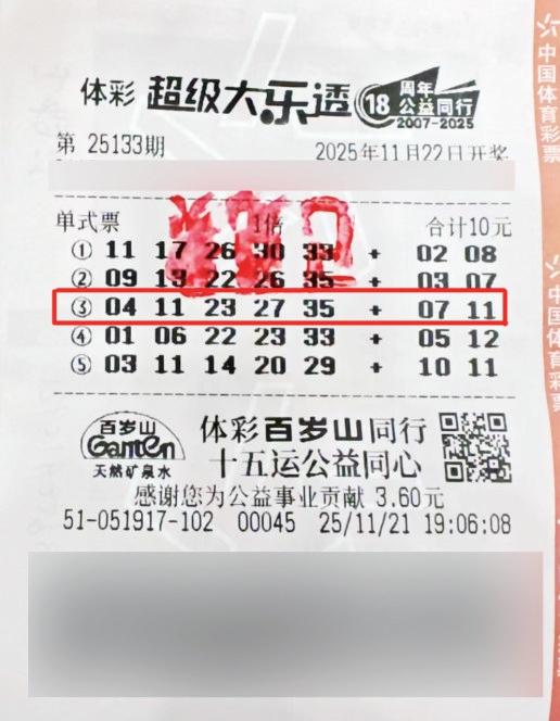 11月22日,超级大乐透第25133期开奖。前区开出号码04、11、23、27、35;后区开出号码07、11。当期本市开出1注基础一等奖,出自一张票面金额为10元的5注直选单式票,单票奖金902万余元。该张大乐透彩票出自位于浦东新区新金桥路738号5F啦啦宝都的市属51917网点。