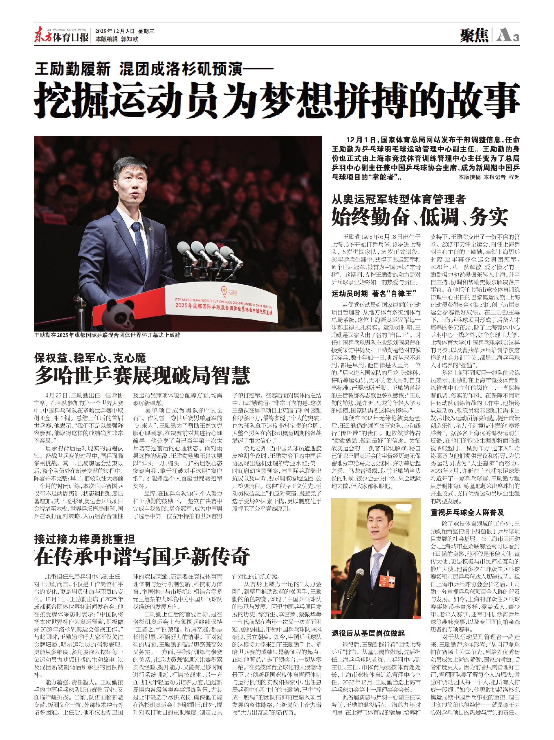 此番担任总局乒羽中心副主任,对王励勤而言,不仅是工作岗位和平台的变化,更是肩负使命与职责的变化。12月1日,王励勤出席了2025年成都混合团体世界杯新闻发布会,他在接受媒体采访时表示:“中国队将把本次世界杯作为奥运预演,积极做好2028年洛杉矶奥运会备战工作。”与此同时,王励勤呼吁大家不仅关注金牌归属,明星运动员的精彩表现,更能从多维度、多角度深入挖掘每一位运动员为梦想拼搏的生动故事,以及混团新赛制背后所彰显的团队精神。