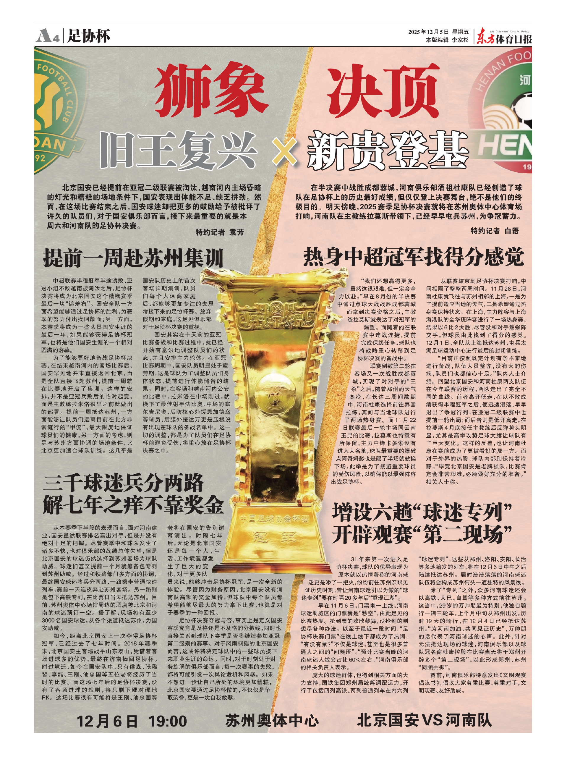 在半决赛中战胜成都蓉城,河南俱乐部酒祖杜康队已经创造了球队在足协杯上的历史最好成绩,但仅仅登上决赛舞台,绝不是他们的终极目的。明天傍晚,2025赛季足协杯决赛就将在苏州奥体中心体育场打响,河南队在主教练拉莫斯带领下,已经早早屯兵苏州,为争冠蓄力。