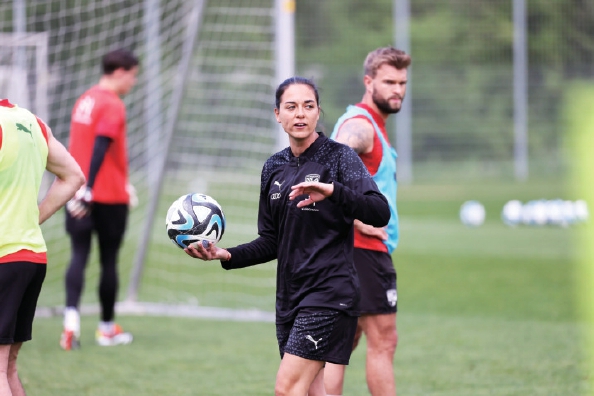 阳光下的沙恩泽训练场,因戈尔施塔特俱乐部的20多个小伙挥汗如雨,充满战斗精神的文身和空气中弥漫的雄性荷尔蒙气息中,来自萨布丽娜的声音格外清晰:“长传!长传!”训练结束后,嗓子略微沙哑的萨布丽娜给球队复盘训练中的问题,最后一句是:“伙计们,我们一定能成功。”