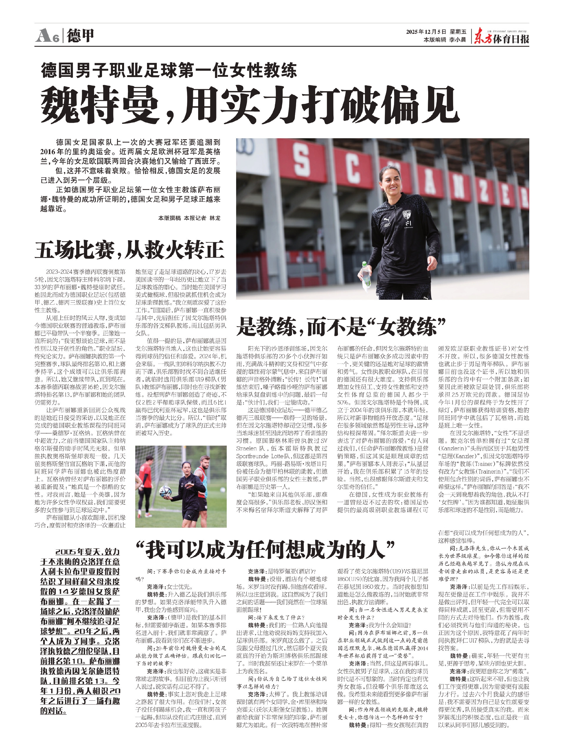 魏特曼:这听起来不错,但也让我们工作变得更难,因为需要更有说服力才行。过去六个月我最大的感悟是:我不需要因为自己是女性就要变得更优秀,队员接受真实的我。而米罗展现出的积极态度,也正是我一直以来从同事们那儿感受到的。