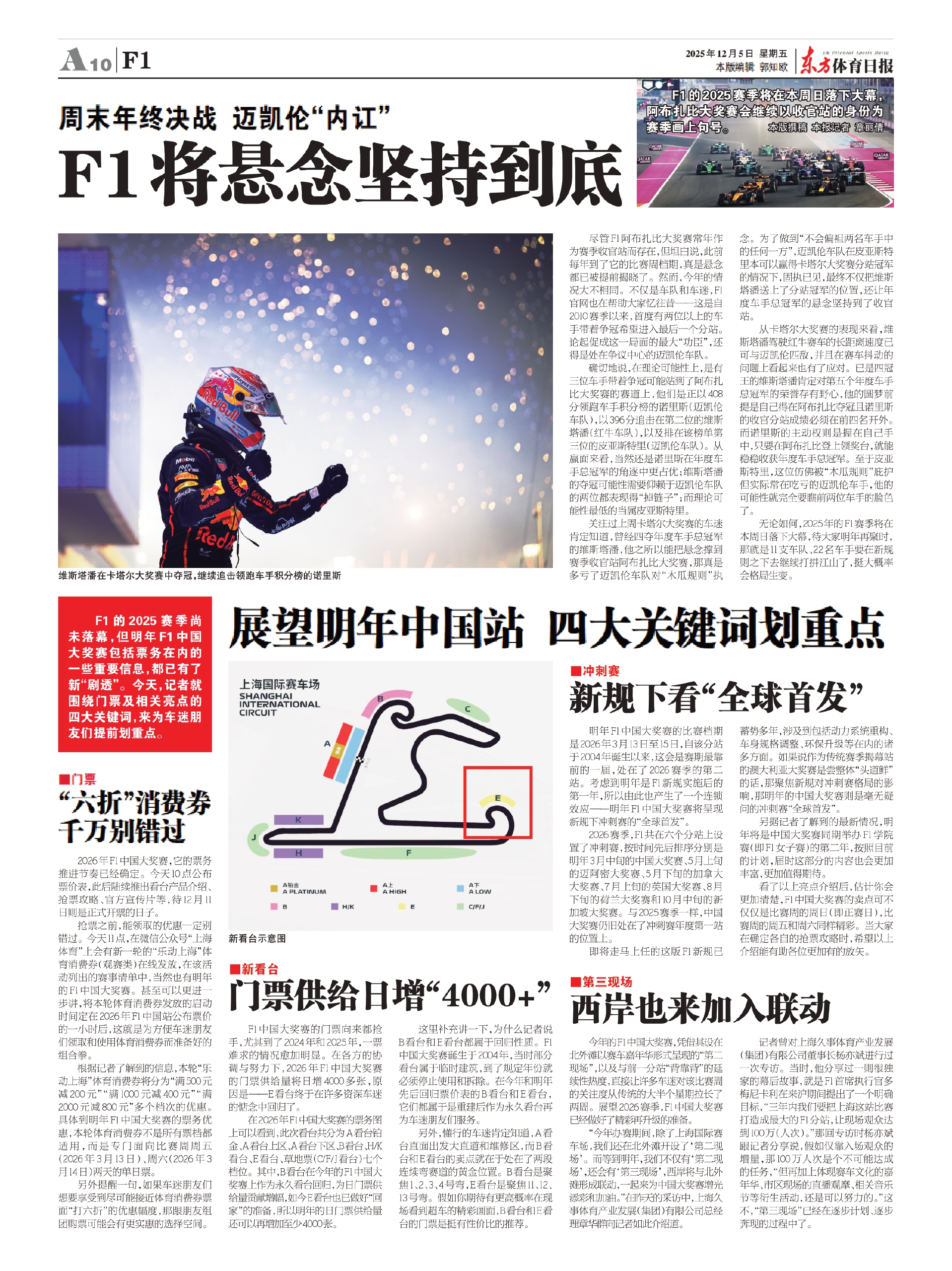 从卡塔尔大奖赛的表现来看,维斯塔潘驾驶红牛赛车的长距离速度已可与迈凯伦匹敌,并且在赛车抖动的问题上看起来也有了应对。已是四冠王的维斯塔潘肯定对第五个年度车手总冠军的荣誉存有野心,他的圆梦前提是自己得在阿布扎比夺冠且诺里斯的收官分站成绩必须在前四名开外。而诺里斯的主动权则是握在自己手中,只要在阿布扎比登上领奖台,就能稳稳收获年度车手总冠军。至于皮亚斯特里,这位仿佛被“木瓜规则”庇护但实际常在吃亏的迈凯伦车手,他的可能性就完全要瞧前两位车手的脸色了。