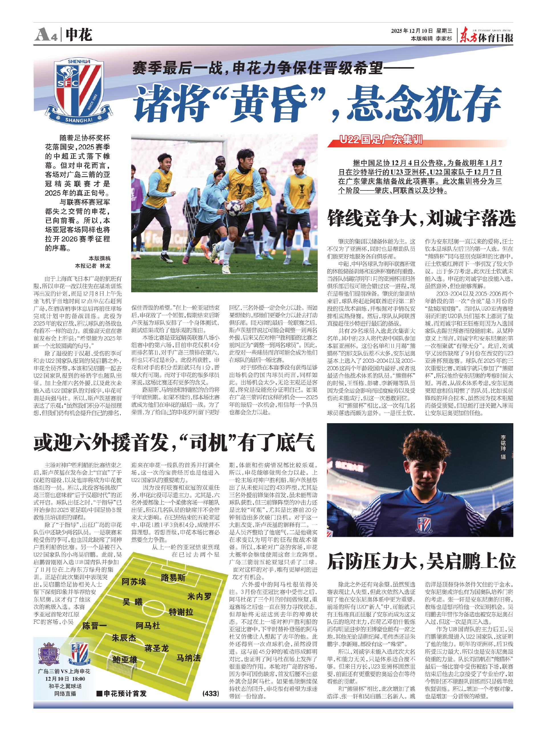 除了“于指导”,出征广岛的申花队伍中还缺少两名队员。一是联赛末轮受伤的李可,他也因此缺席了同神户胜利船的比赛。另一个是被召入U22国家队的小将吴启鹏。此前,吴启鹏曾刚刚入选U18国青队并参加了11月份在上海东方绿舟的集训。正是在此次集训中表现突出,吴启鹏给足协相关人士留下深刻印象并举荐给安东尼奥,这才有了他这次的跳级入选。本赛季亚冠首轮对江原FC的客场,小吴迎来在申花一线队的首秀并打满全场,这一次的宝贵经历也是他进入U22国家队的重要助力。