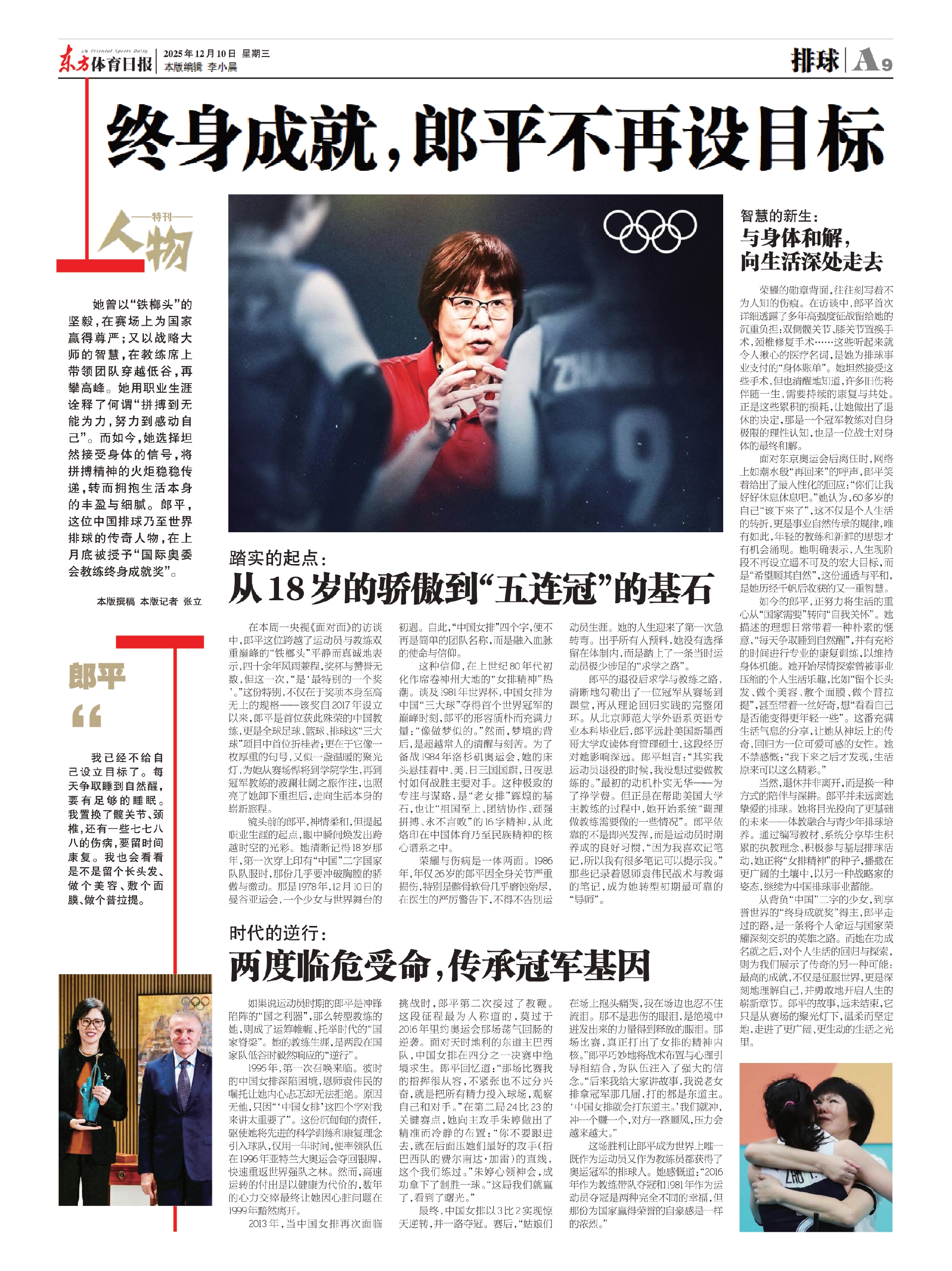 她曾以“铁榔头”的坚毅,在赛场上为国家赢得尊严;又以战略大师的智慧,在教练席上带领团队穿越低谷,再攀高峰。她用职业生涯诠释了何谓“拼搏到无能为力,努力到感动自己”。而如今,她选择坦然接受身体的信号,将拼搏精神的火炬稳稳传递,转而拥抱生活本身的丰盈与细腻。郎平,这位中国排球乃至世界排球的传奇人物,在上月底被授予“国际奥委会教练终身成就奖”。