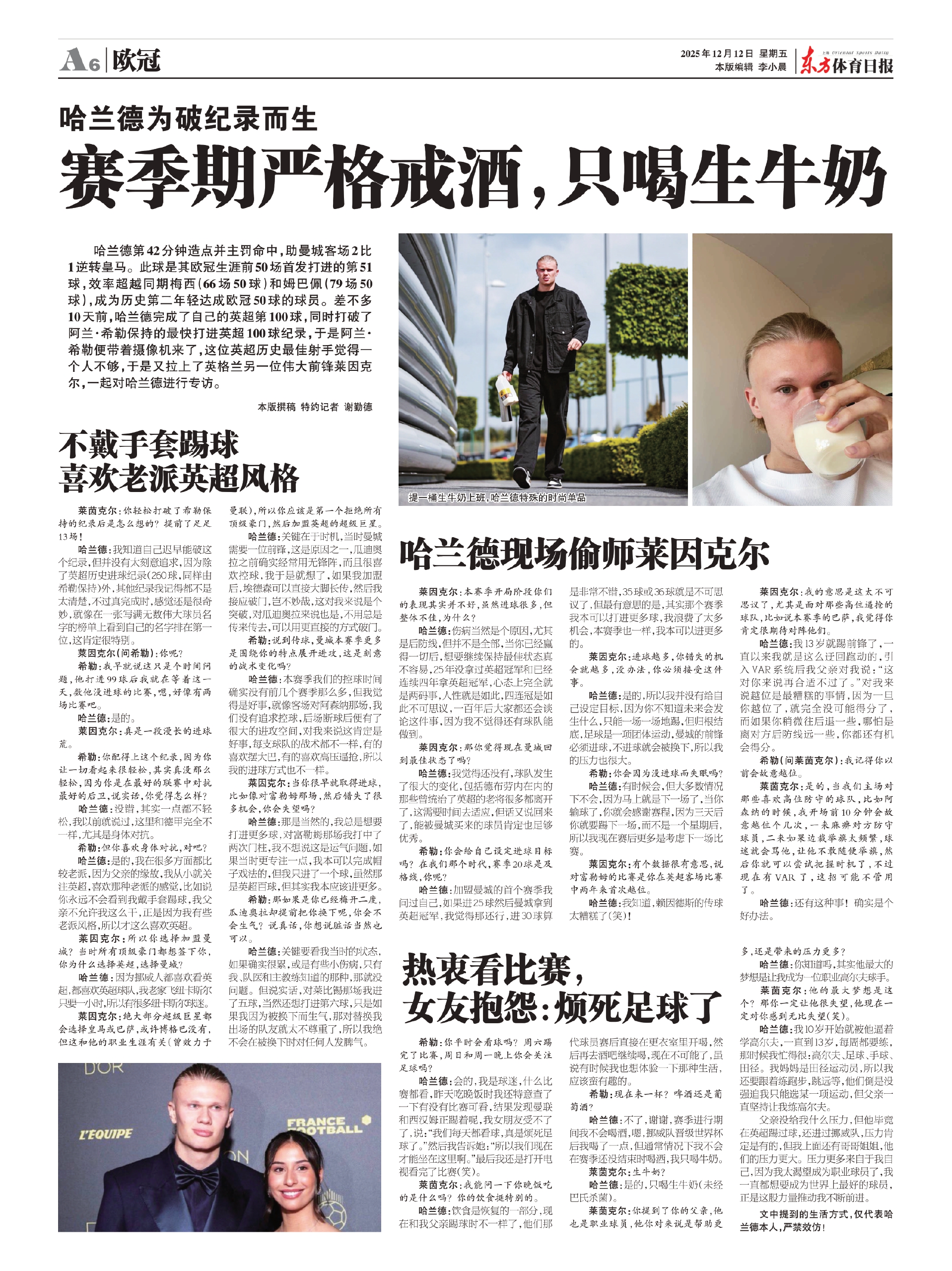 哈兰德:会的,我是球迷,什么比赛都看,昨天吃晚饭时我还特意查了一下有没有比赛可看,结果发现曼联和西汉姆正踢着呢,我女朋友受不了了,说:“我们每天都看球,真是烦死足球了。”然后我告诉她:“所以我们现在才能坐在这里啊。”最后我还是打开电视看完了比赛(笑)。