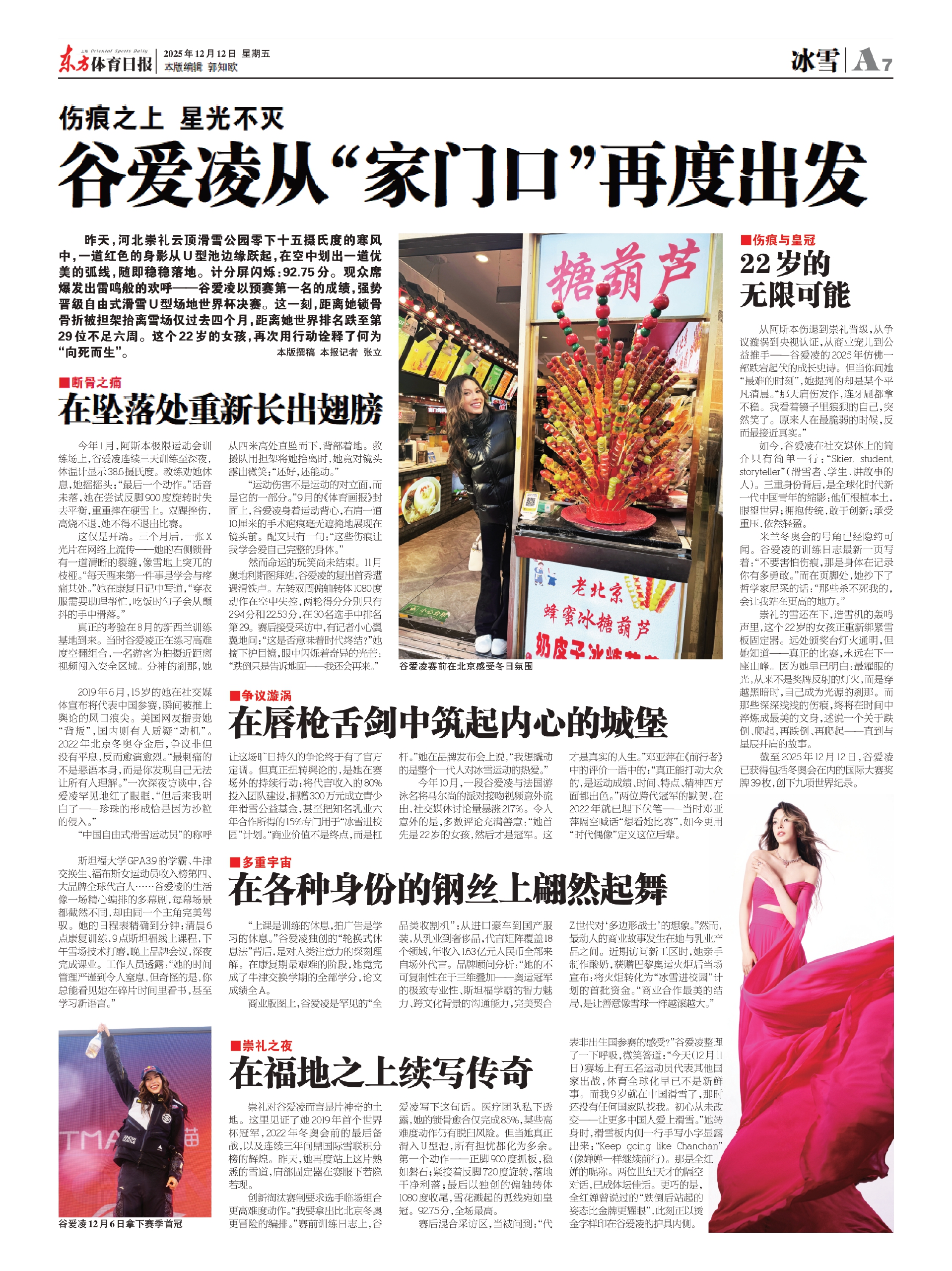 从阿斯本伤退到崇礼晋级,从争议漩涡到央视认证,从商业宠儿到公益推手——谷爱凌的2025年仿佛一部跌宕起伏的成长史诗。但当你问她“最难的时刻”,她提到的却是某个平凡清晨。“那天肩伤发作,连牙刷都拿不稳。我看着镜子里狼狈的自己,突然笑了。原来人在最脆弱的时候,反而最接近真实。”