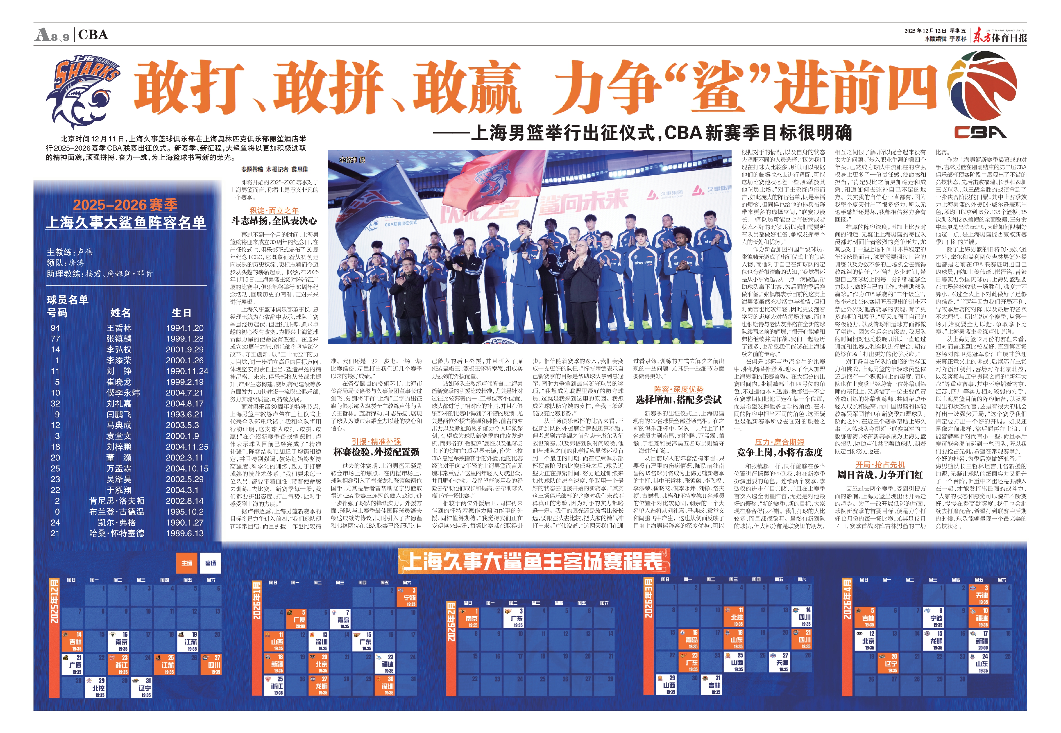 北京时间12月11日,上海久事篮球俱乐部在上海奥林匹克俱乐部丽笙酒店举行2025-2026赛季CBA联赛出征仪式。新赛季、新征程,大鲨鱼将以更加积极进取的精神面貌,顽强拼搏、奋力一跳,为上海篮球书写新的荣光。