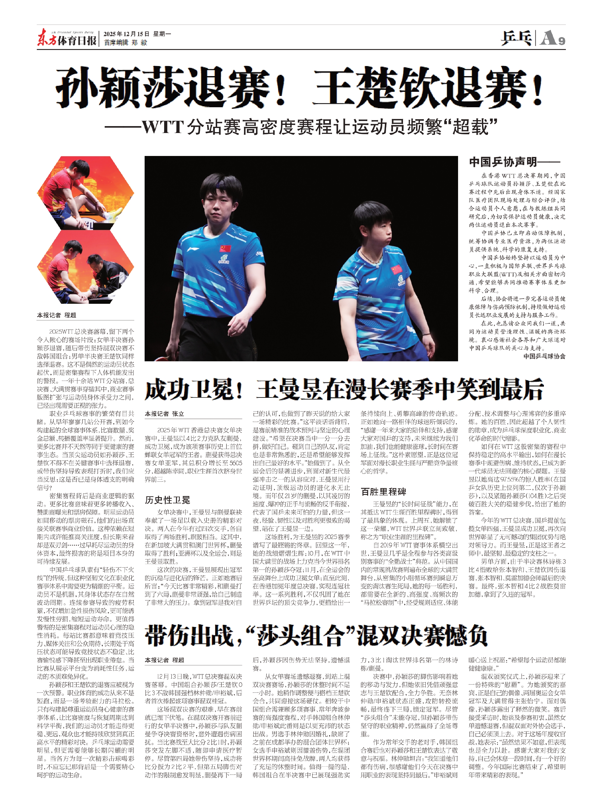 2025WTT总决赛落幕,留下两个令人揪心的赛场片段:女单半决赛孙颖莎退赛,随后带伤坚持混双决赛不敌韩国组合;男单半决赛王楚钦同样选择退赛。这不是偶然的运动员状态起伏,而是密集赛程下人体机能发出的警报。一年十余站WTT分站赛,总决赛、大满贯赛事穿插其中,商业赛事版图扩张与运动员身体承受力之间,已经出现需要正视的张力。