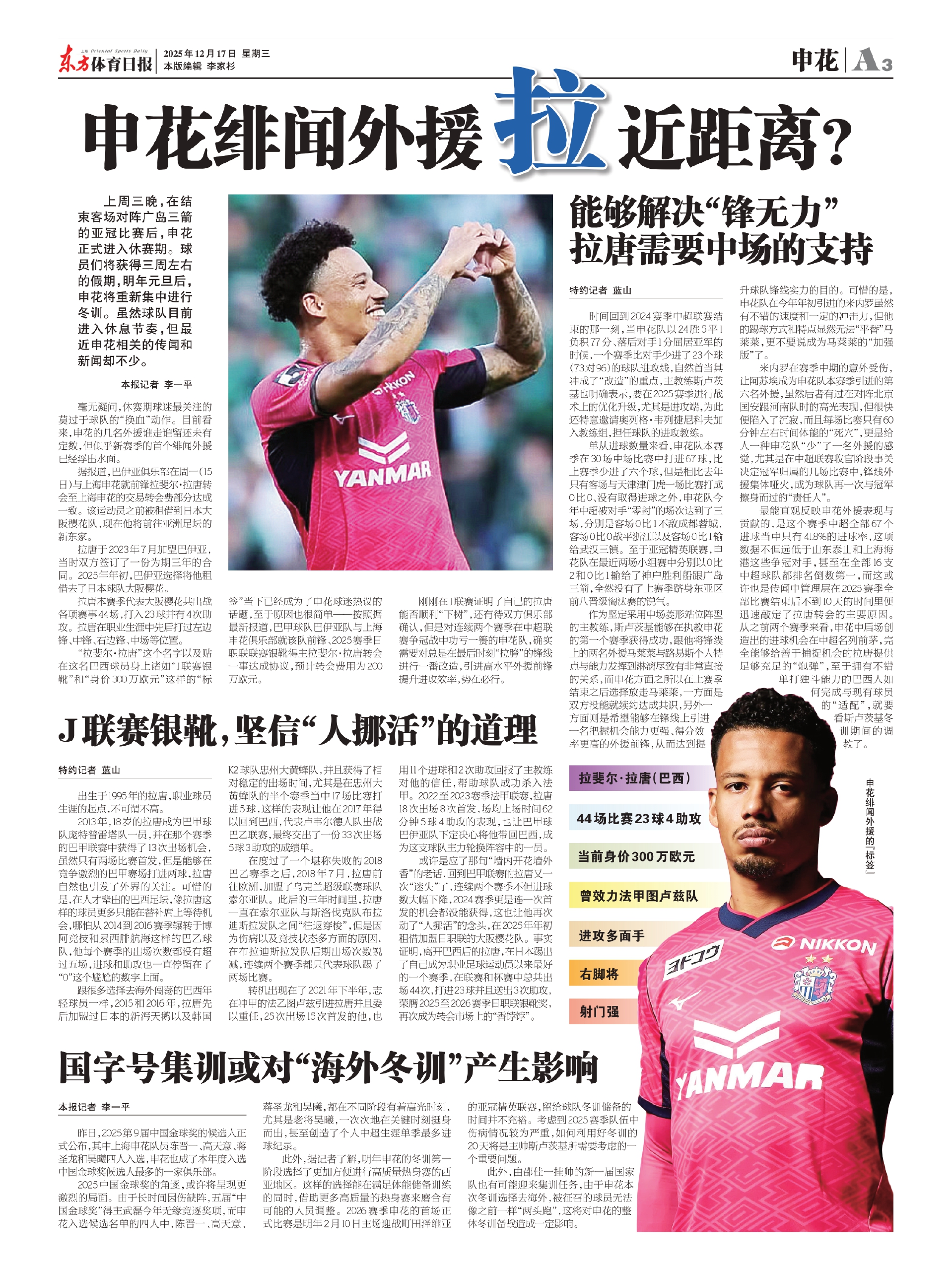 刚刚在J联赛证明了自己的拉唐能否顺利“下树”,还有待双方俱乐部确认,但是对连续两个赛季在中超联赛争冠战中功亏一篑的申花队,确实需要对总是在最后时刻“拉胯”的锋线进行一番改造,引进高水平外援前锋提升进攻效率,势在必行。