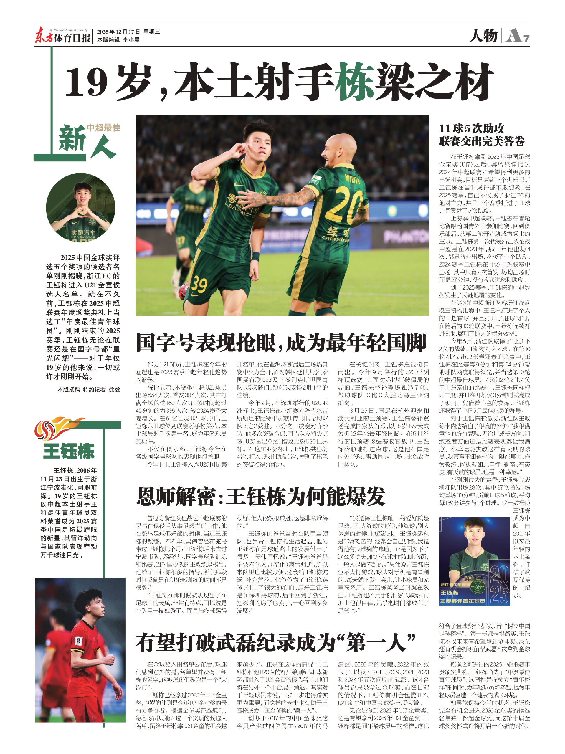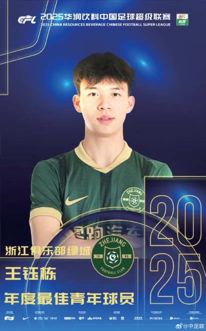 2025中国金球奖评选五个奖项的候选者名单刚刚揭晓,浙江FC的王钰栋进入U21金童候选人名单。就在不久前,王钰栋在2025中超联赛年度颁奖典礼上当选了“年度最佳青年球员”。刚刚结束的2025赛季,王钰栋无论在联赛还是在国字号都“星光闪耀”——对于年仅19岁的他来说,一切或许才刚刚开始。