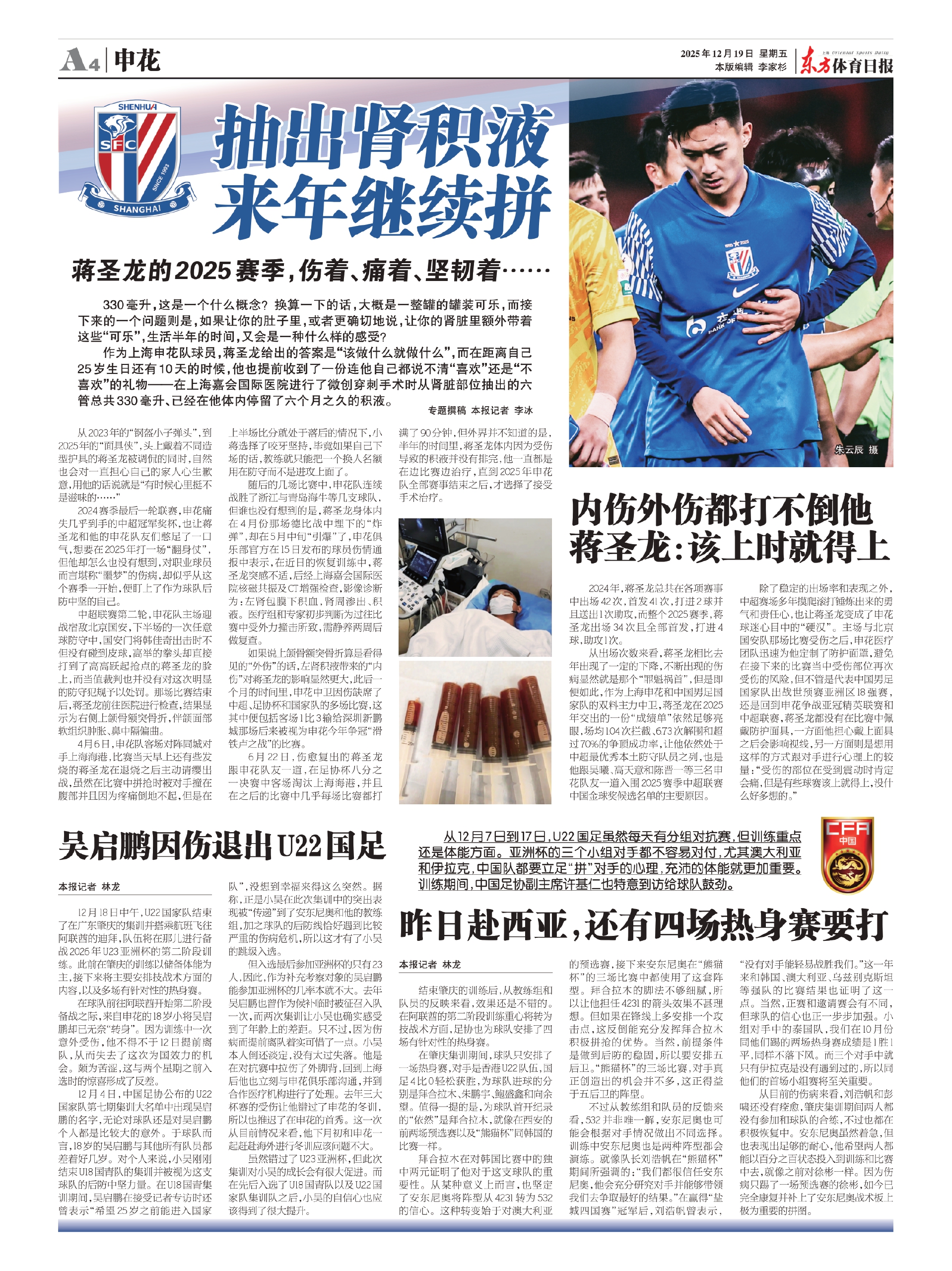 2024赛季最后一轮联赛,申花痛失几乎到手的中超冠军奖杯,也让蒋圣龙和他的申花队友们憋足了一口气,想要在2025年打一场“翻身仗”,但他却怎么也没有想到,对职业球员而言堪称“噩梦”的伤病,却似乎从这个赛季一开始,便盯上了作为球队后防中坚的自己。