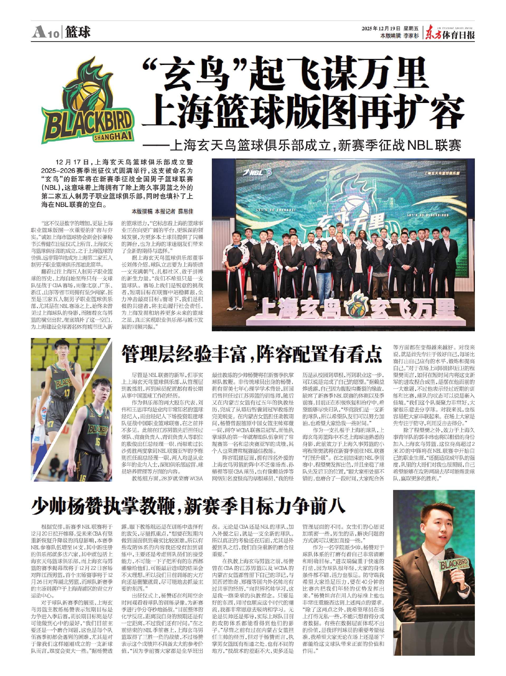12月17日,上海玄天鸟篮球俱乐部成立暨2025-2026赛季出征仪式圆满举行,这支被命名为“玄鸟”的新军将在新赛季征战全国男子篮球联赛(NBL),这意味着上海拥有了除上海久事男篮之外的第二家五人制男子职业篮球俱乐部,同时也填补了上海在NBL联赛的空白。