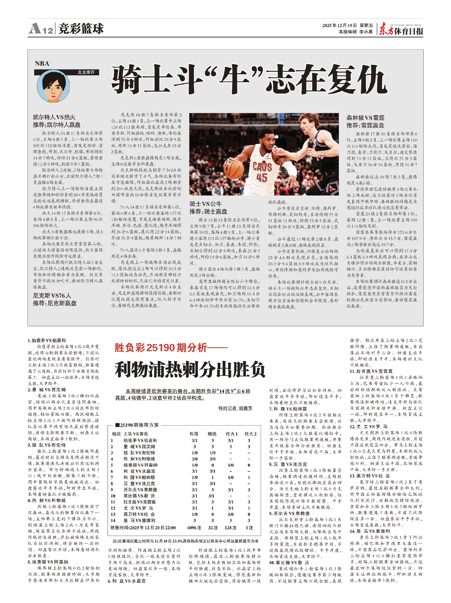 尼克斯刚战胜马刺拿下NBA杯冠军极大提升了士气,本场比赛布伦森可能缺阵,阿奴诺比最近2场都拿到20+状态火热,尼克斯放弃此前的双塔阵容改让哈特首发效果非常不错。