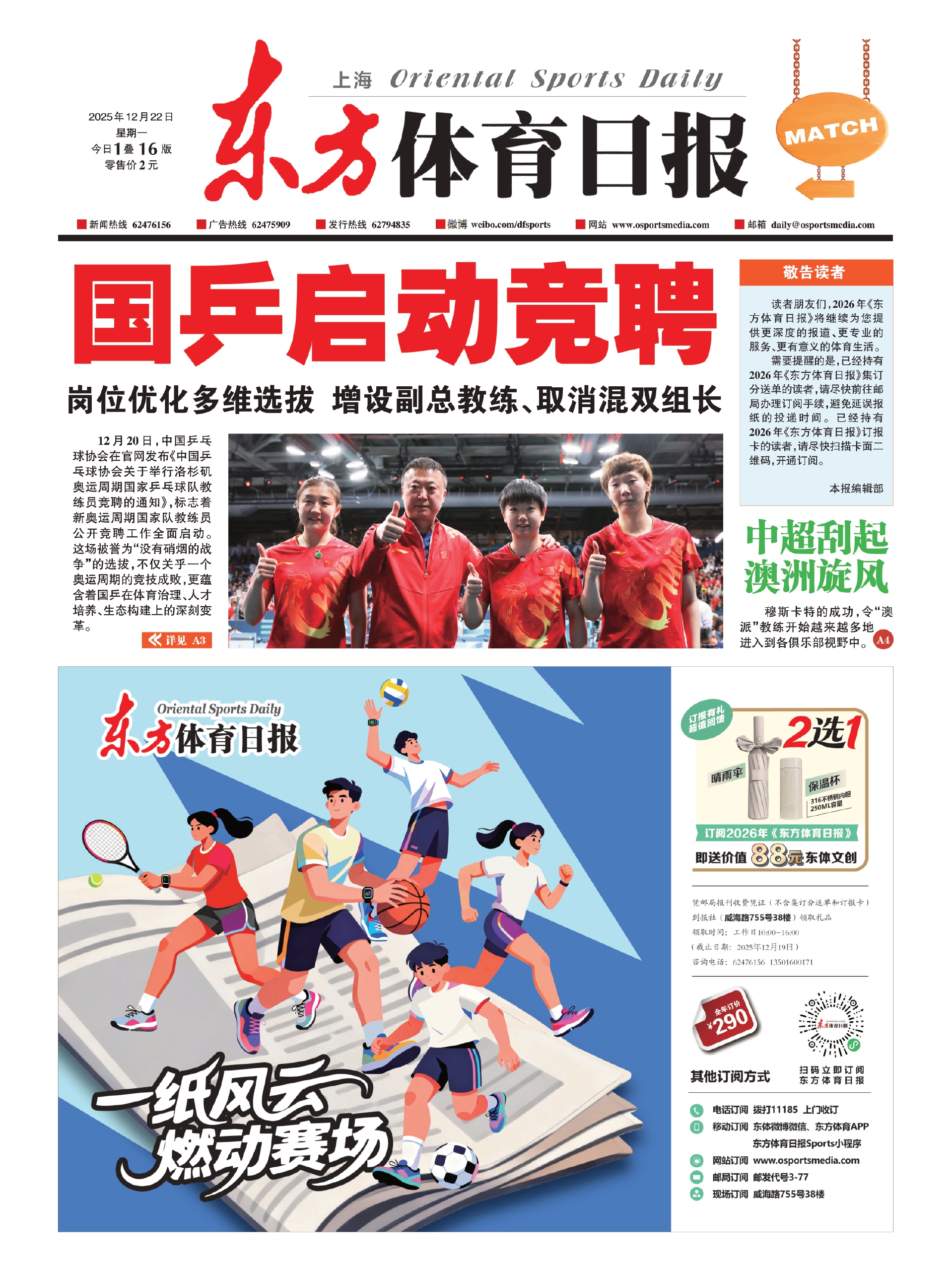 12月20日,中国乒乓球协会在官网发布《中国乒乓球协会关于举行洛杉矶奥运周期国家乒乓球队教练员竞聘的通知》,标志着新奥运周期国家队教练员公开竞聘工作全面启动。这场被誉为“没有硝烟的战争”的选拔,不仅关乎一个奥运周期的竞技成败,更蕴含着国乒在体育治理、人才培养、生态构建上的深刻变革。 详见 A3