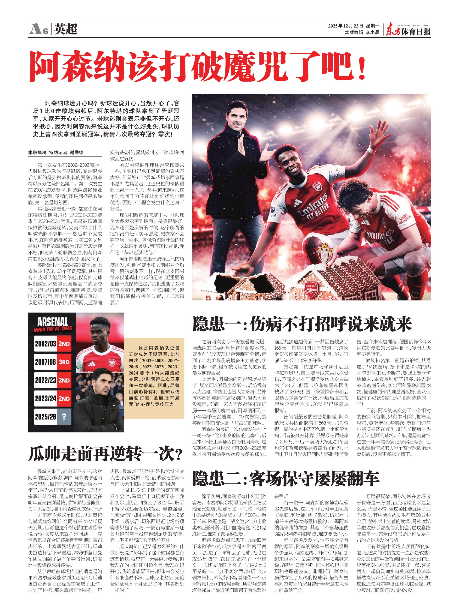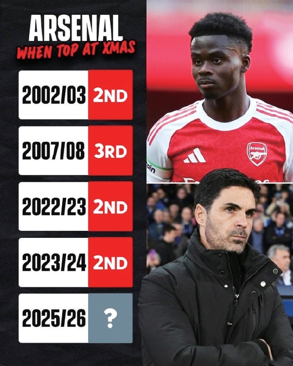 这是阿森纳队史第五次成为圣诞冠军,此前四次(2002-2003 、2007-2008 、2022-2023 、2023-2024赛季)均未能最终夺冠,分别获得三次亚军和一次季军。因此,尽管目前形势有利,但球队仍面临打破“圣诞冠军魔咒”的心理与竞技压力