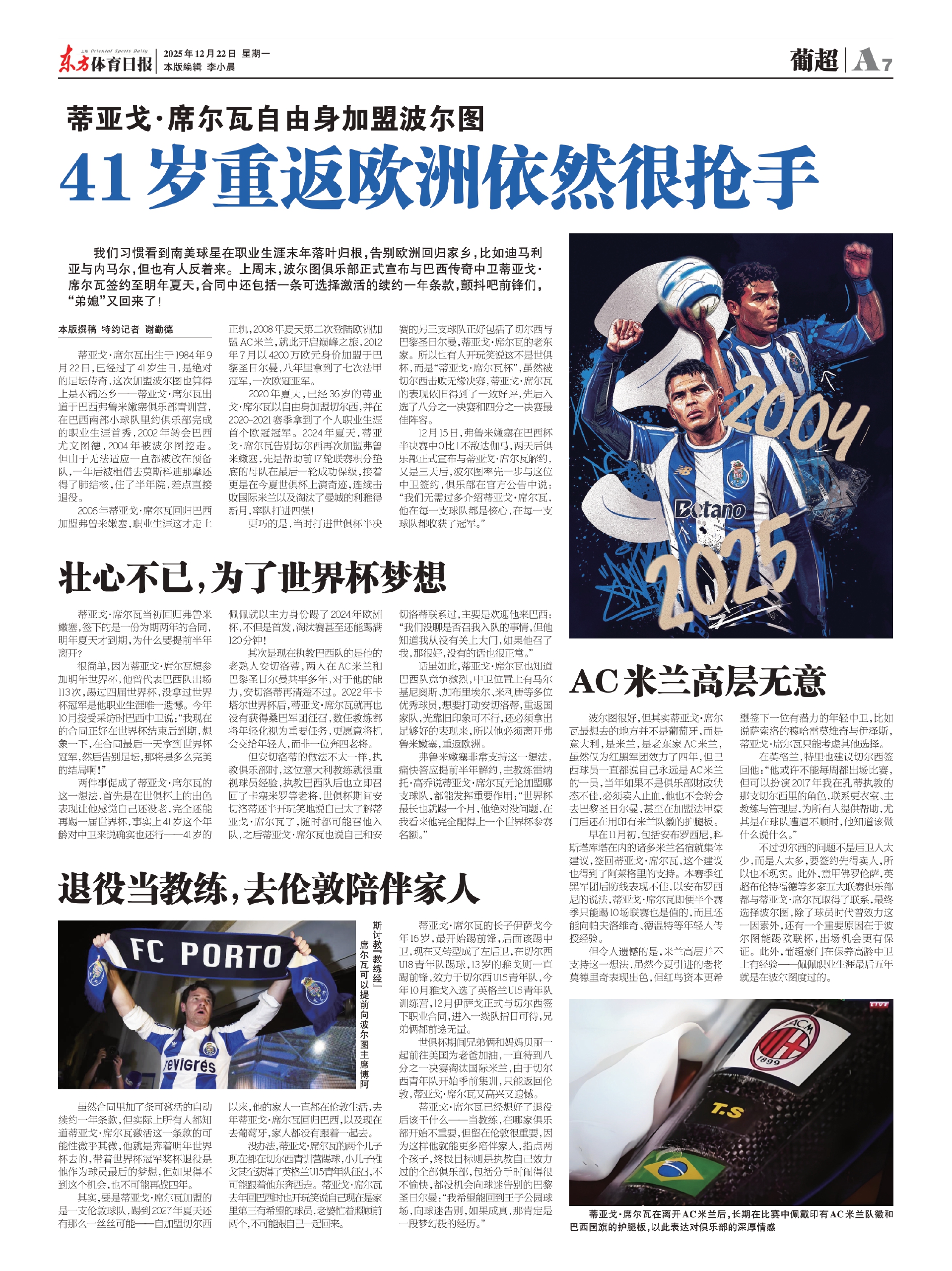波尔图很好,但其实蒂亚戈·席尔瓦最想去的地方并不是葡萄牙,而是意大利,是米兰,是老东家AC米兰,虽然仅为红黑军团效力了四年,但巴西球员一直都说自己永远是AC米兰的一员,当年如果不是俱乐部财政状态不佳,必须卖人止血,他也不会转会去巴黎圣日尔曼,甚至在加盟法甲豪门后还在用印有米兰队徽的护腿板。