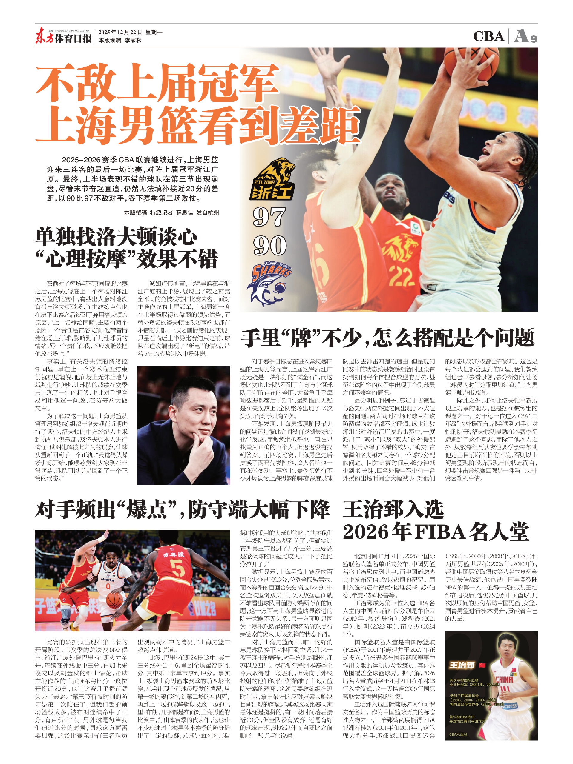 不难发现,上海男篮现阶段最大的问题还是彼此之间没有找到最好的化学反应,而教练组似乎也一直在寻找最为正确的五个人,但迟迟没有找到答案。前四场比赛,上海男篮先后更换了两套先发阵容,12人名单也一直在做变动。事实上,赛季初就有不少外界认为上海男篮的阵容深度是球队足以去冲击四强的理由,但呈现到比赛中的状态就是教练组暂时还没有找到如何将个体捏合成型的方法,甚至在试阵容的过程中出现了个别球员之间不兼容的情况。
