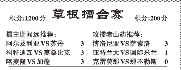 编者按:东方彩经竞彩大联赛从2017年3月起推出“草根擂台赛”,每期由两名草根选手单选3场比赛PK,中1场得100分,中2场得300分,3场全中得600分。上周擂主命中3场,攻擂者命中1场。