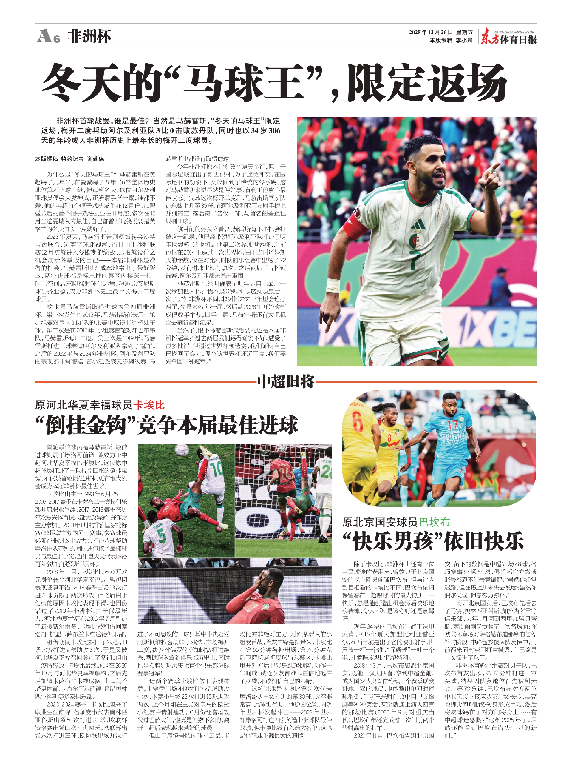 非洲杯首轮战罢,谁是最佳?当然是马赫雷斯,“冬天的马球王”限定返场,梅开二度帮助阿尔及利亚队3比0击败苏丹队,同时也以34岁306天的年龄成为非洲杯历史上最年长的梅开二度球员。