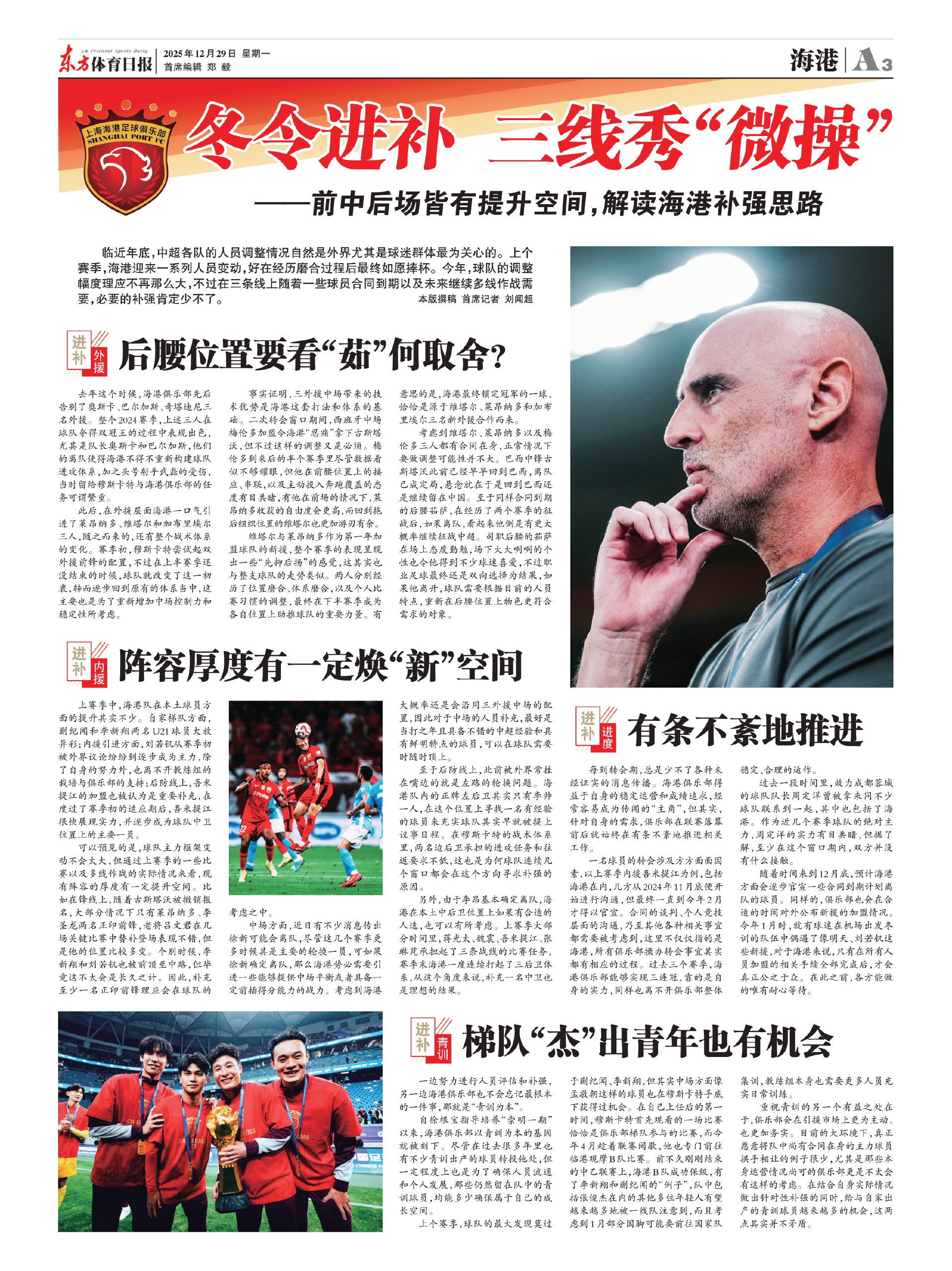 上个赛季,球队的最大发现莫过于蒯纪闻、李新翔,但其实中场方面像孟敬朝这样的球员也在穆斯卡特手底下获得过机会。在自己上任后的第一时间,穆斯卡特首先观看的一场比赛恰恰是俱乐部梯队参与的比赛,而今年4月趁着联赛间歇,他也专门前往临港观摩B队比赛。前不久刚刚结束的中乙联赛上,海港B队成功保级,有了李新翔和蒯纪闻的“例子”,队中包括张俊杰在内的其他多位年轻人有望越来越多地被一线队注意到,而且考虑到1月部分国脚可能要前往国家队集训,教练组本身也需要更多人员充实日常训练。
