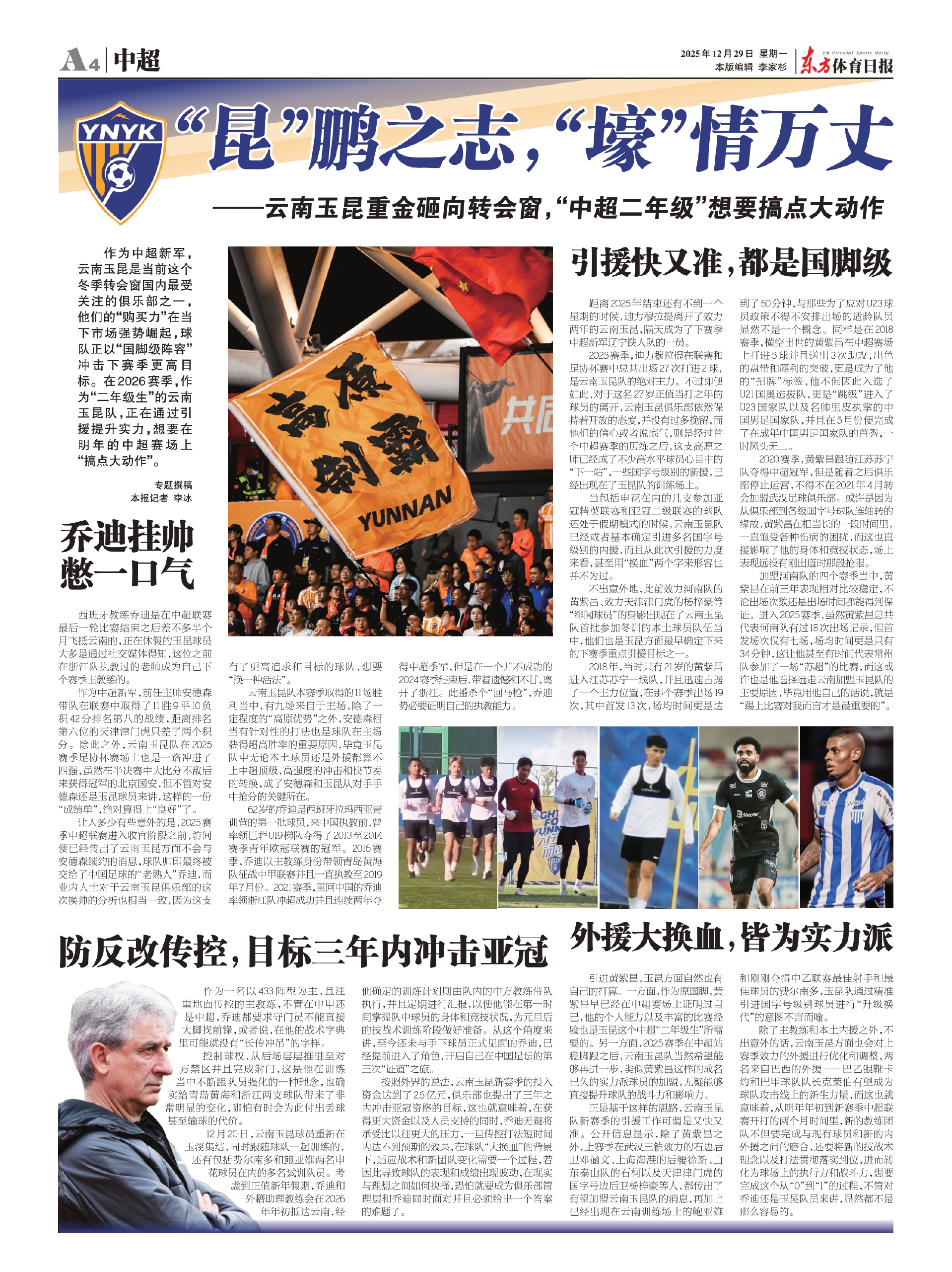 12月20日,云南玉昆球员重新在玉溪集结,同时跟随球队一起训练的,还有包括费尔南多和鲍亚雄两名申花球员在内的多名试训队员。考虑到正值新年假期,乔迪和外籍助理教练会在2026年年初抵达云南,经他确定的训练计划则由队内的中方教练带队执行,并且定期进行汇报,以便他能在第一时间掌握队中球员的身体和竞技状况,为元旦后的技战术训练阶段做好准备。从这个角度来讲,至今还未与手下球员正式见面的乔迪,已经提前进入了角色,开启自己在中国足坛的第三次“证道”之旅。
