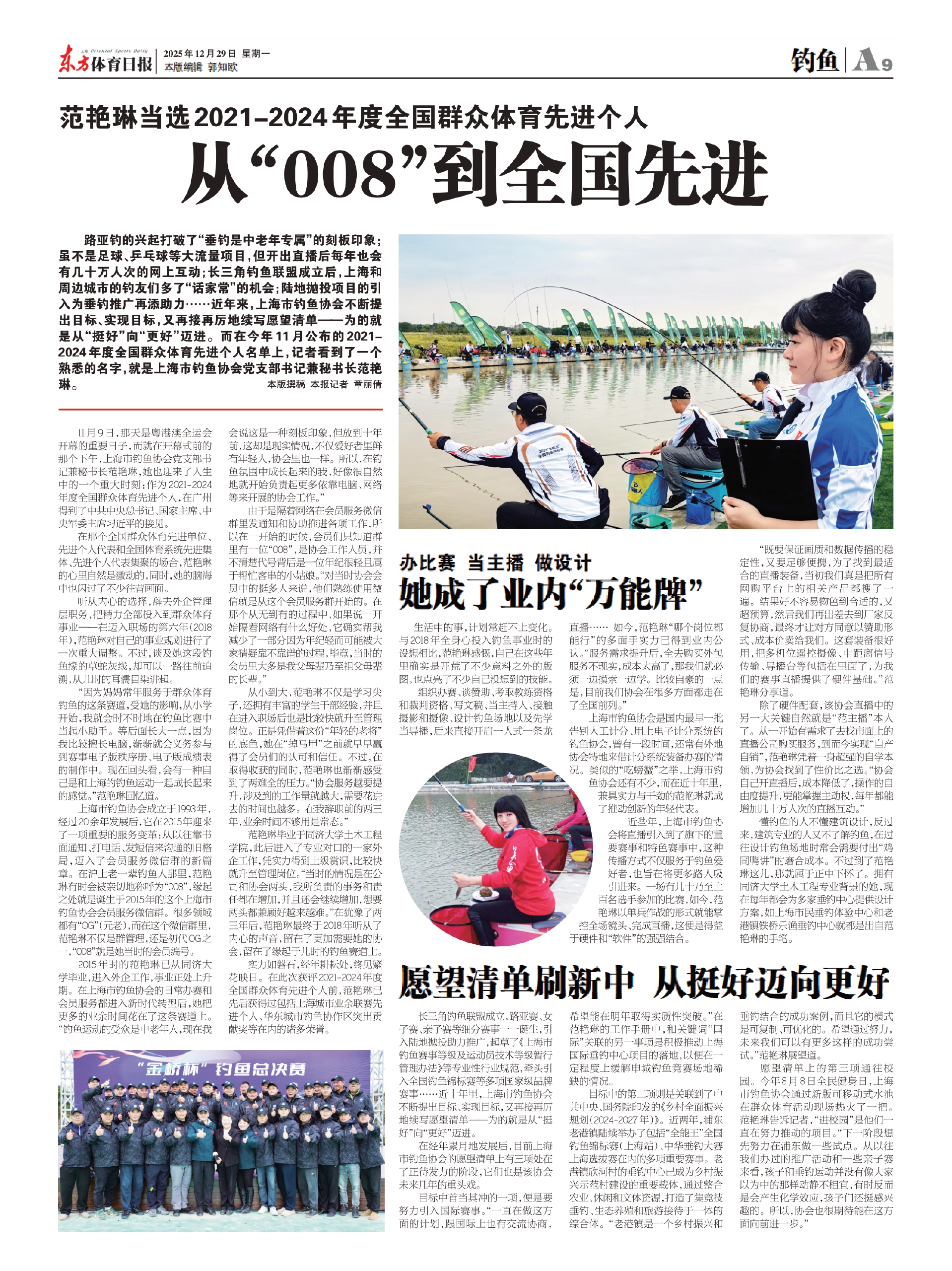 路亚钓的兴起打破了“垂钓是中老年专属”的刻板印象;虽不是足球、乒乓球等大流量项目,但开出直播后每年也会有几十万人次的网上互动;长三角钓鱼联盟成立后,上海和周边城市的钓友们多了“话家常”的机会;陆地抛投项目的引入为垂钓推广再添助力……近年来,上海市钓鱼协会不断提出目标、实现目标,又再接再厉地续写愿望清单——为的就是从“挺好”向“更好”迈进。而在今年11月公布的2021-2024年度全国群众体育先进个人名单上,记者看到了一个熟悉的名字,就是上海市钓鱼协会党支部书记兼秘书长范艳琳。 本版撰稿 本报记者 章丽倩