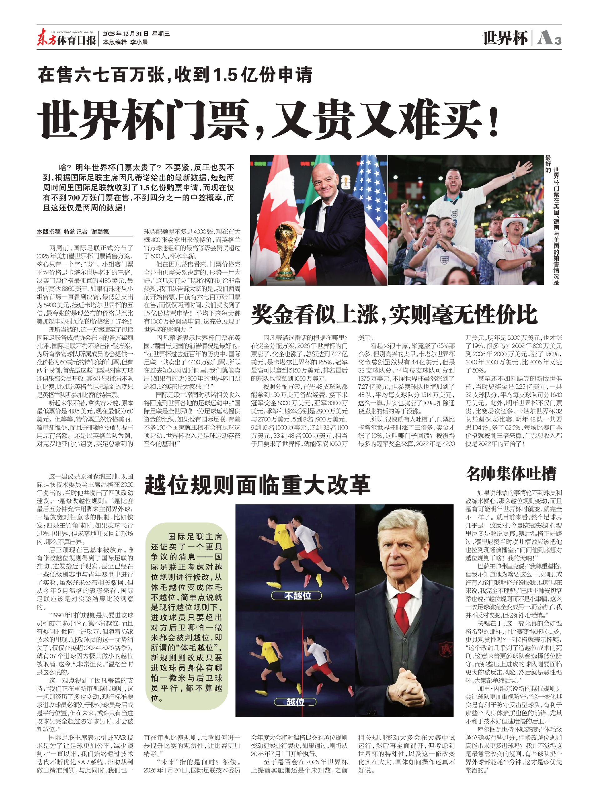 所以,很快就有人吐槽了,门票比卡塔尔世界杯时涨了三倍多,奖金才涨了10%,这叫哪门子回馈?按涨得最多的冠军奖金来算,2022年是4200万美元,明年是5000万美元,也才涨了19%,很多吗?2002年800万美元到2006年2000万美元,涨了150%,2010年3000万美元,比2006年又涨了50%。