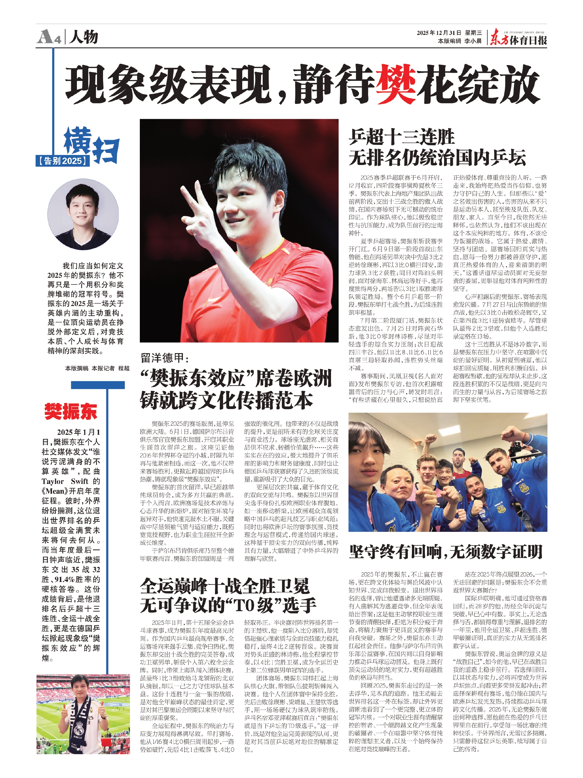 2025年1月1日,樊振东在个人社交媒体发文“谁说污泥满身的不算英雄”,配曲Taylor Swift的《Mean》开启年度征程。彼时,外界纷纷揣测,这位退出世界排名的乒坛超级金满贯未来将何去何从。而当年度最后一日钟声临近,樊振东交出35战32胜、91.4%胜率的硬核答卷。这份成绩背后,是他退排名后乒超十三连胜、全运十战全胜,更是在德国乒坛掀起现象级“樊振东效应”的辉煌。