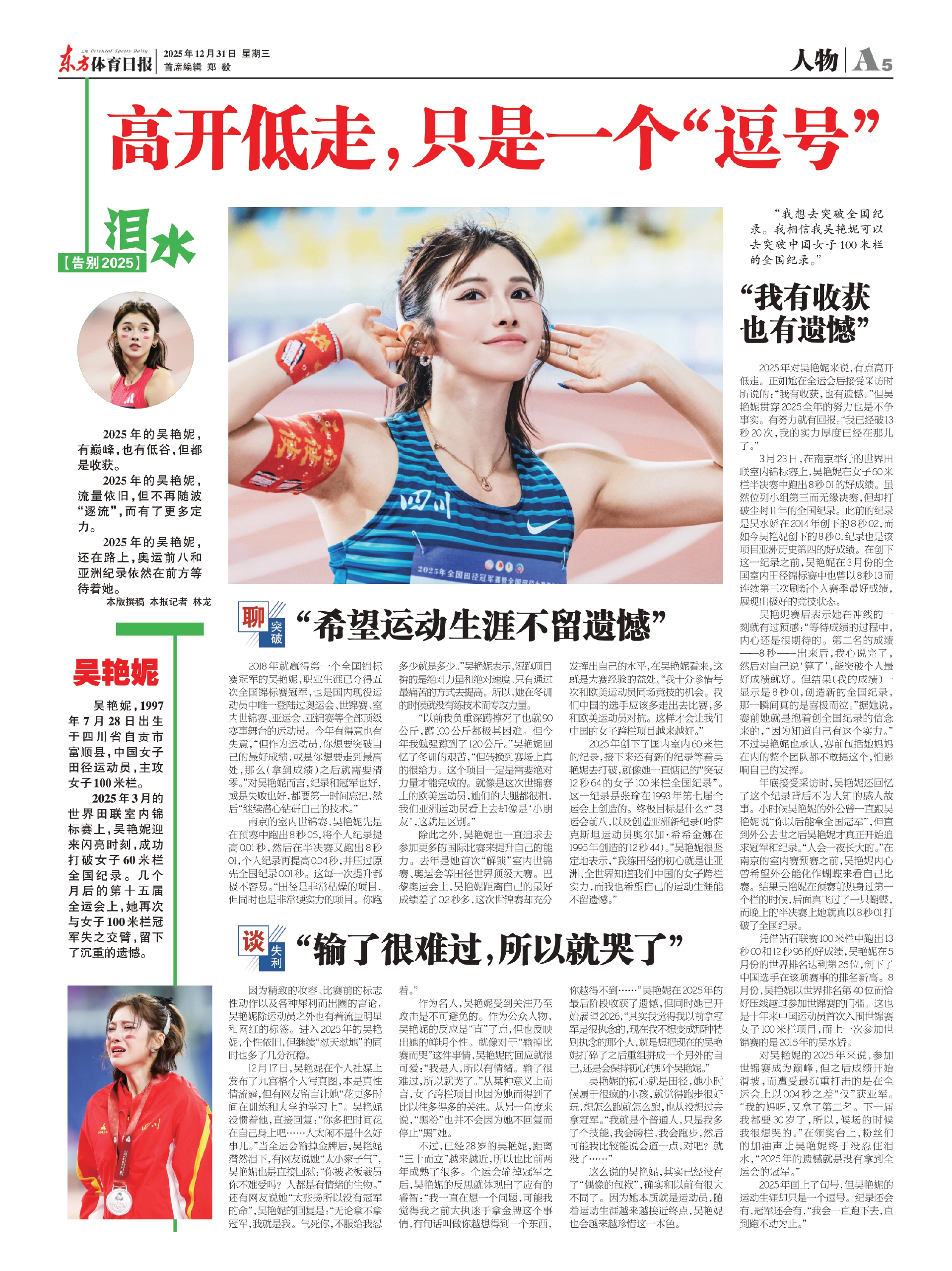 对吴艳妮的2025年来说,参加世锦赛成为巅峰,但之后成绩开始滑坡,而遭受最沉重打击的是在全运会上以0.04秒之差“仅”获亚军。“我的妈呀,又拿了第二名。下一届我都要30岁了,所以,候场的时候我很想哭的。”在领奖台上,粉丝们的加油声让吴艳妮终于没忍住泪水,“2025年的遗憾就是没有拿到全运会的冠军。”