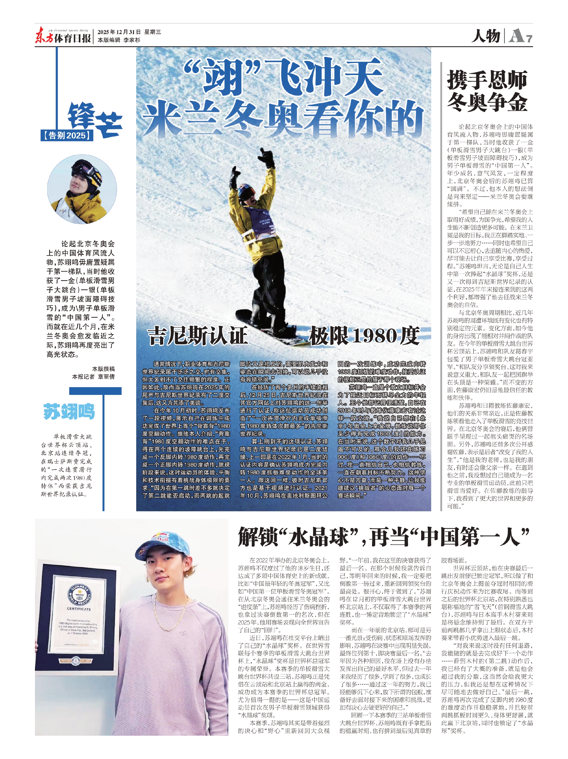 “希望自己能在米兰冬奥会上取得好成绩,为国争光,希望我的人生能不断创造更多可能。在米兰卫冕是我的目标,我正在脚踏实地、一步一步地努力……同时也希望自己可以不忘初心,去追随内心的热爱,尽可能去让自己享受比赛,享受过程。”苏翊鸣坦言,无论是自己人生中第一次捧起“水晶球”奖杯,还是又一次得到吉尼斯世界纪录的认证,在2025年年末接连来到的这两个利好,都增强了他去征战米兰冬奥会的自信。