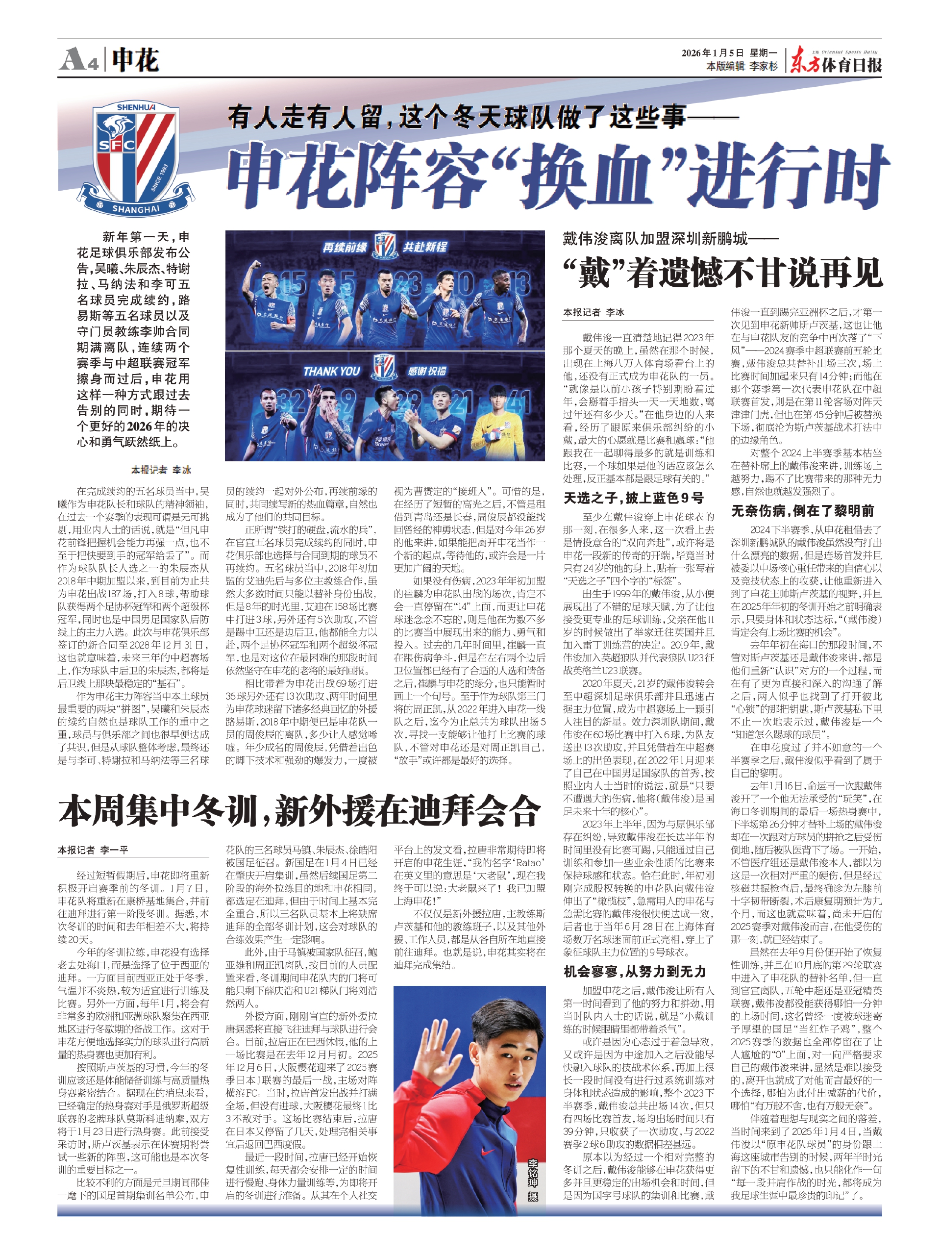 新年第一天,申花足球俱乐部发布公告,吴曦、朱辰杰、特谢拉、马纳法和李可五名球员完成续约,路易斯等五名球员以及守门员教练李帅合同期满离队,连续两个赛季与中超联赛冠军擦身而过后,申花用这样一种方式跟过去告别的同时,期待一个更好的2026年的决心和勇气跃然纸上。